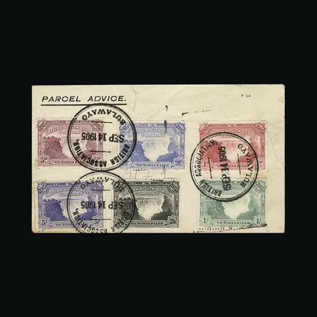 1905 BRITISH ASSOCIATION BULAWAYO-SEP 14 cancels on Falls set(6) on 'PARCEL ADVICE' envelope, small tear at top {C} [US5] (Start Price / Minimum Bid) = £159.20) (Image)
