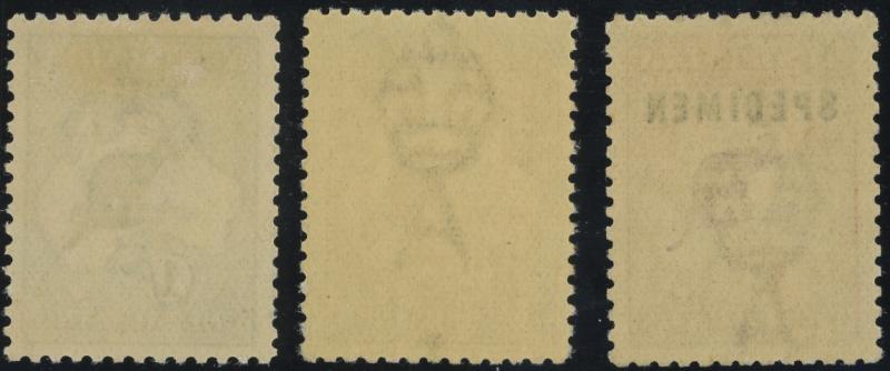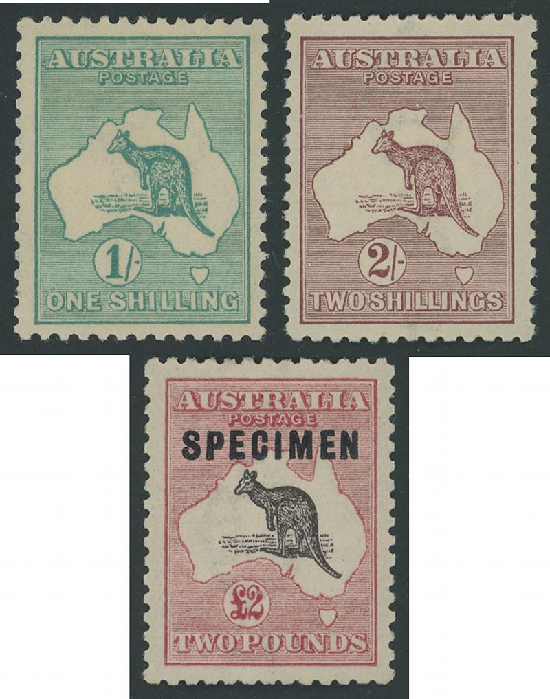 1/- deep blue-green, 2/- maroon (unmounted) & £2 purple-black & rose-carmine with Type C 'SPECIMEN' Overprint ACSC 32B 38A & 56Cxb