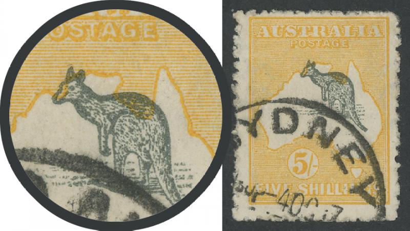 5/- grey & yellow SG 30 with Kangaroo Misplaced Upwards into Joseph Bonaparte Gulf and Gulf of Carpentaria ACSC 43Aca,