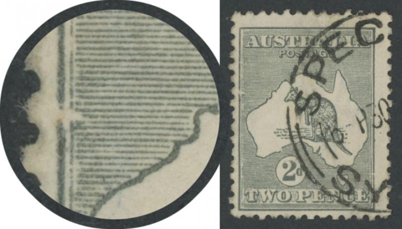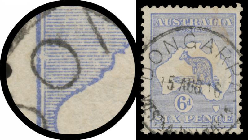 characteristic fluffy perfs, Sydney cds cancel of '-4OC17' well clear of the variety, Cat $7500 (£350+ for normal). The ACSC records only one example (also used) with a 3½mm misplacement out of the map to the left into the Timor Sea. Another example