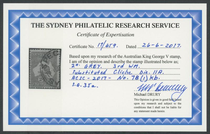 2d grey Die I Watermark Inverted ACSC 71(1)a (SG 35bw) marginal single from the right-hand side of the sheet with Cut Throat