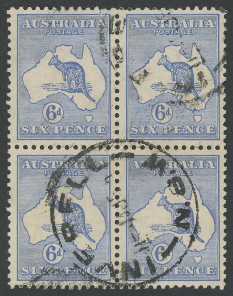 6d ultramarine ACSC 18 (SG 26) block of 4, well-centred, largely very fine Inverell (NSW) cds cancels, Cat $160+ (£100+) for
