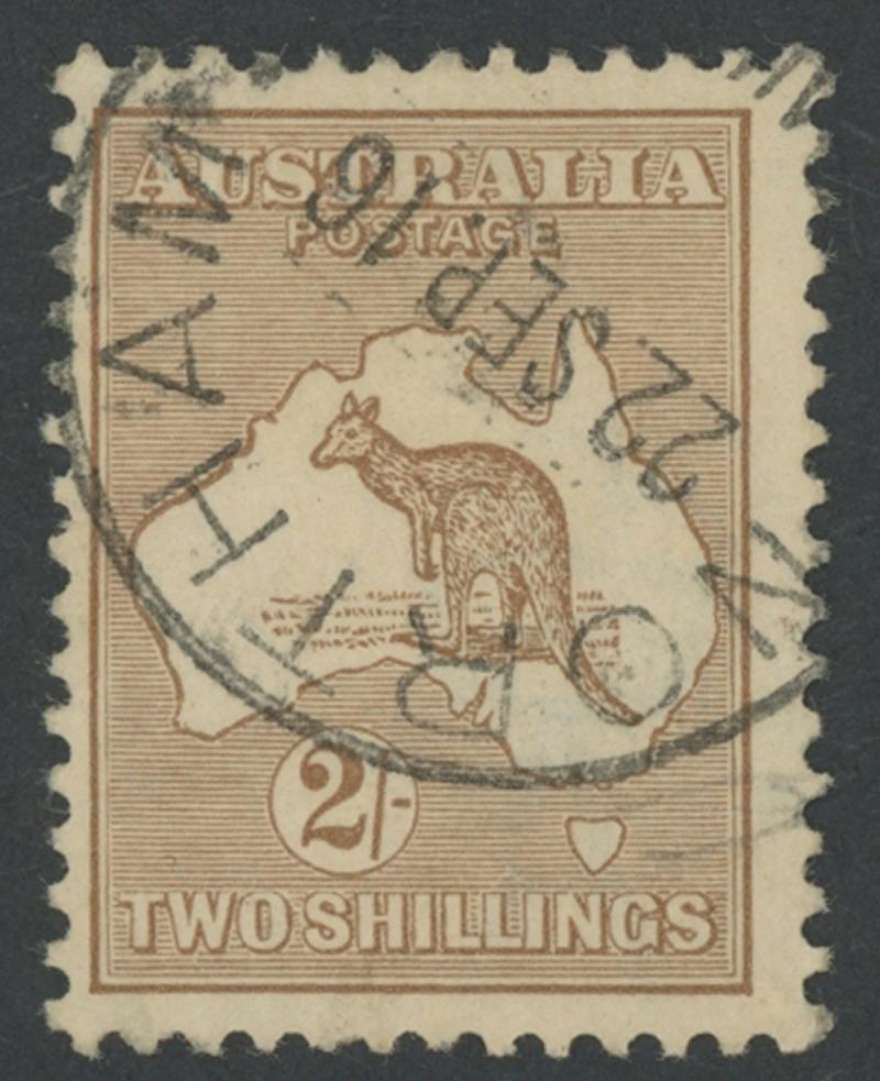 2/- light brown ACSC 36 (SG 29), neat large-part Northam (WA) cds cancel of '22SEP16', Cat $350 (£225). (Image1) (Image2)