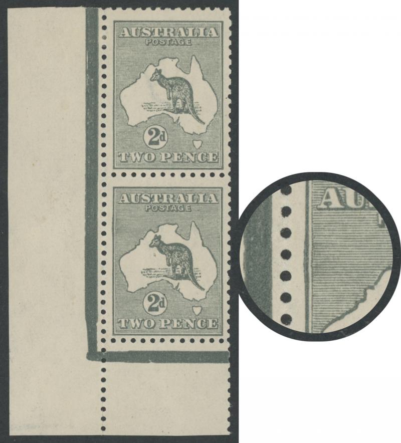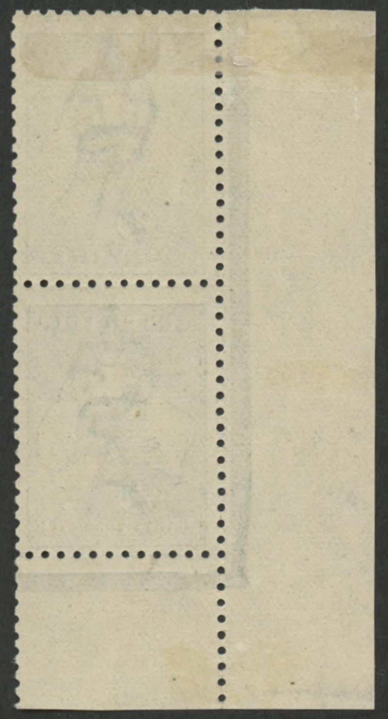 2d grey Die I SG 35 marginal vertical pair from the lower-left corner of the sheet, the lower unit with Retouched Left Frame and