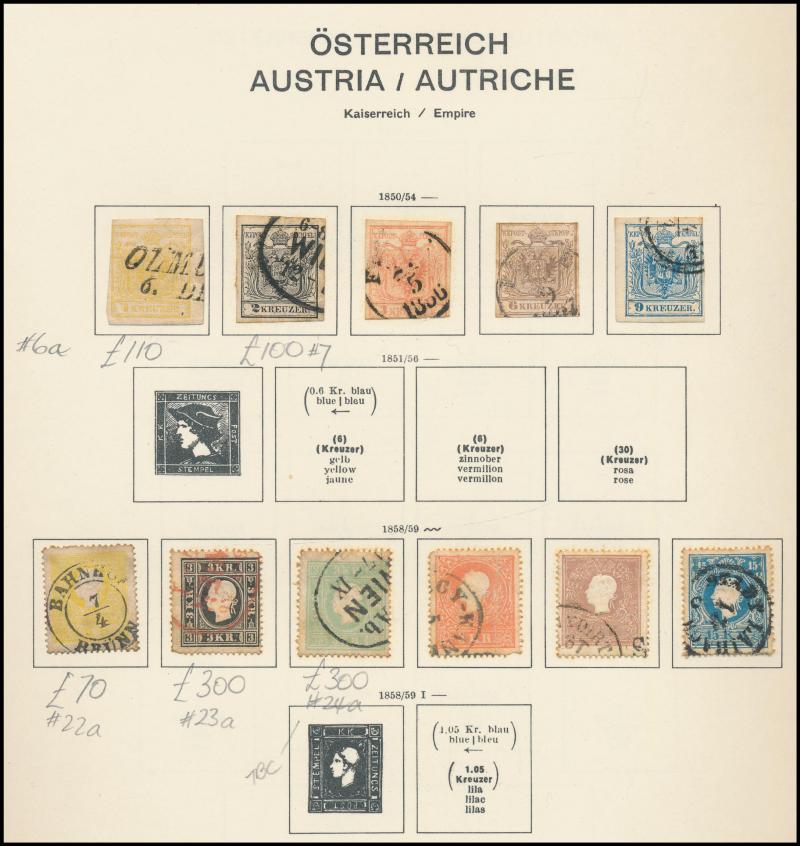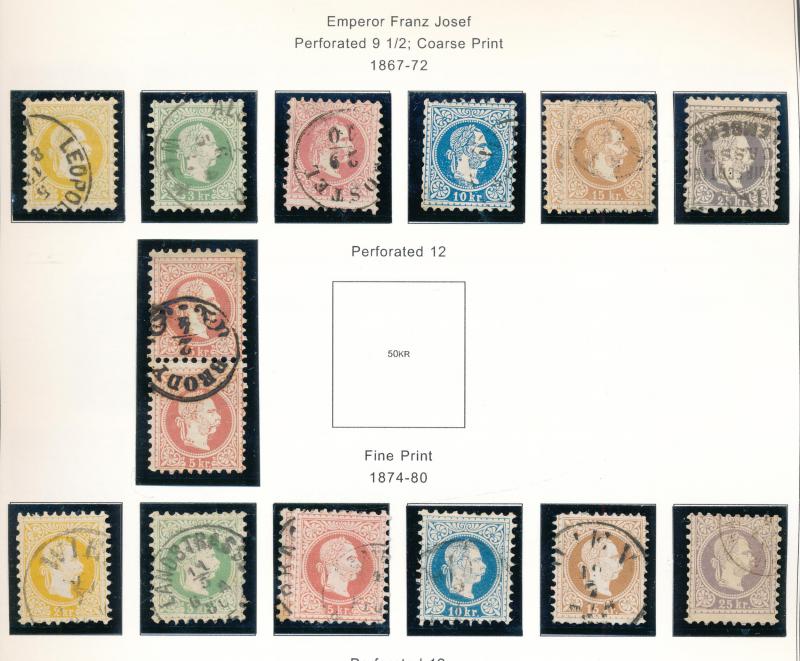 Neat collection with two pages of imperfs & other Classics, Coarse Beard to 25kr, Fine Beard to 25kr, 1890 Granite Paper to 2kr,