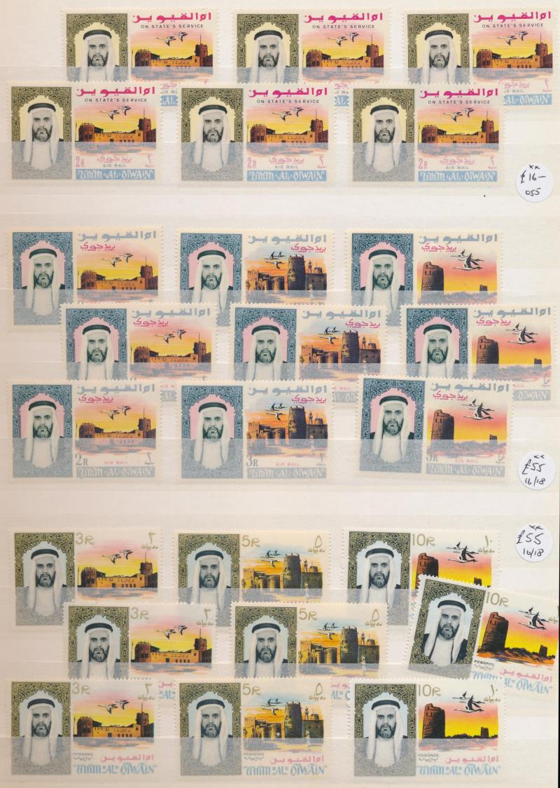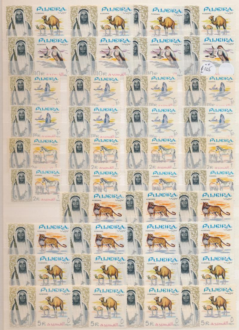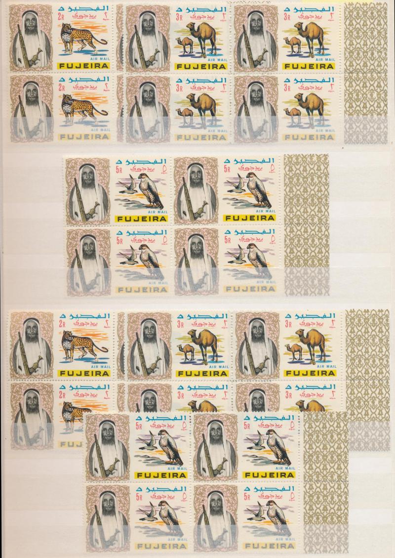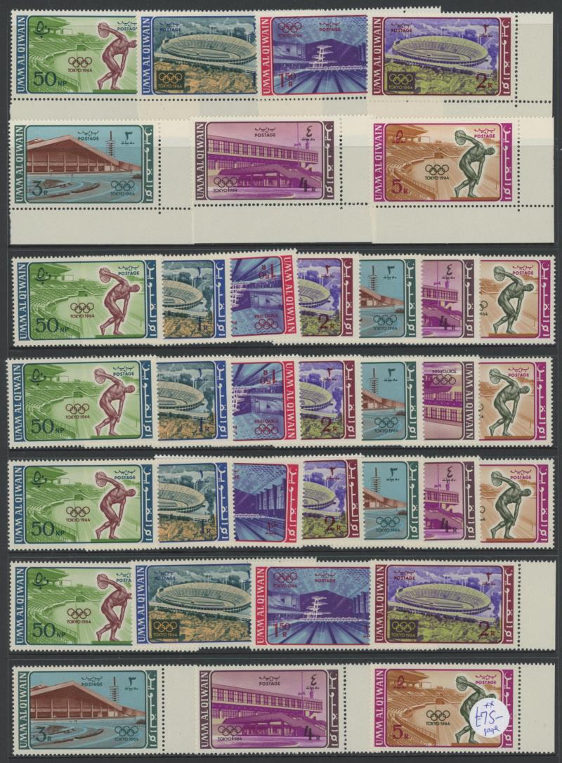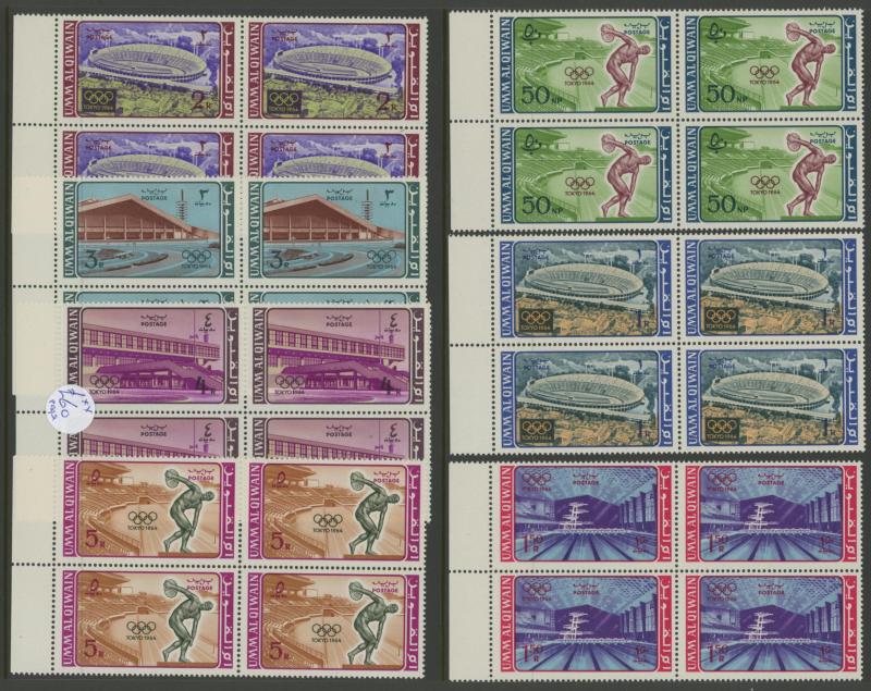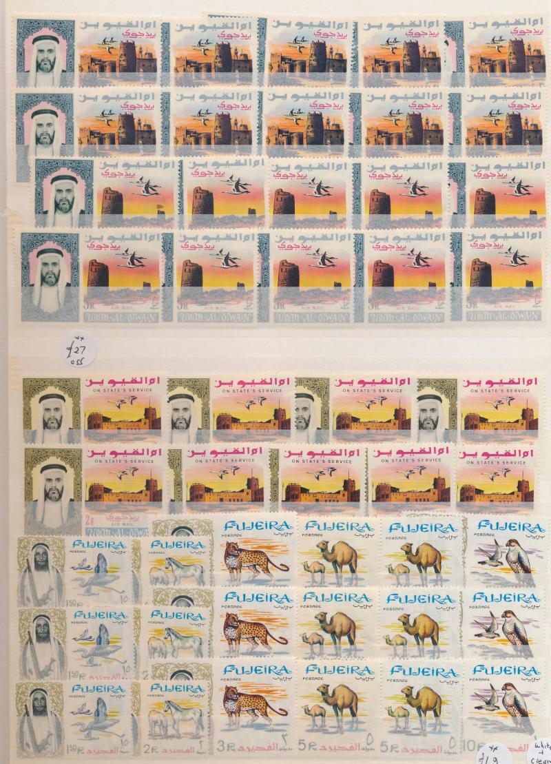 with blocks of 4, and 1965 Gibbons Centenary sets with M/Ss; Fujeira 1964 Pictorials Cream & White Papers, plus blocks of 4, 1965 Kennedy high values, Umm al Qiwain 1964 Pictorials, and Olympics with blocks of 4, 1965 Kennedy high values blocks of 4