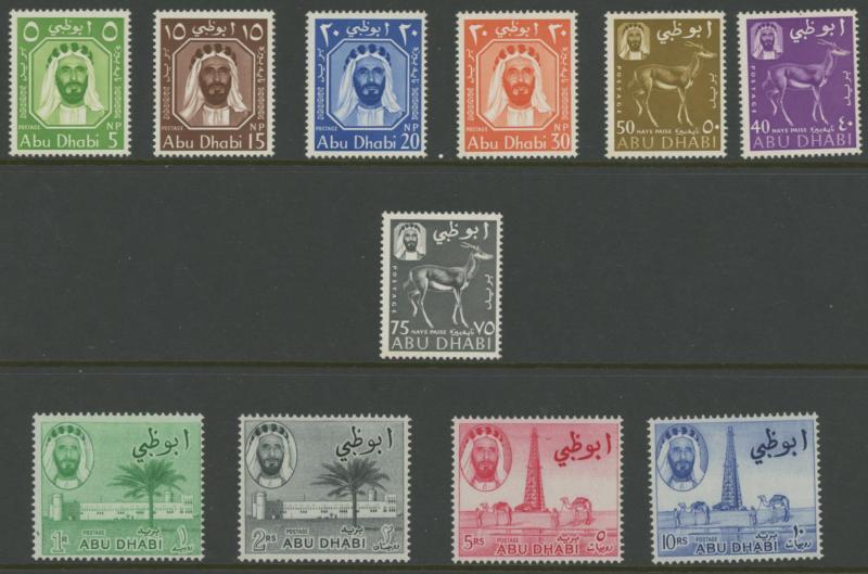 ADU DHABI: 1964 Definitives set SG 1-11 * & used/CTO plus 1966 New Currency overprints set SG 15-25 * & used/CTO, the * very