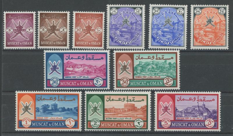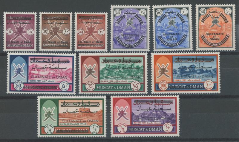 OMAN: 1966-67 Crest & Fort set SG 94-105 plus 1971 New Currency 'SULTANATE OF OMAN' Overprint set SG 122-133, all unmounted, Cat