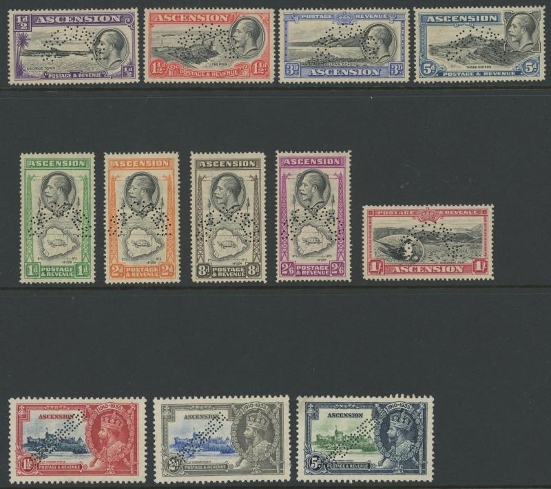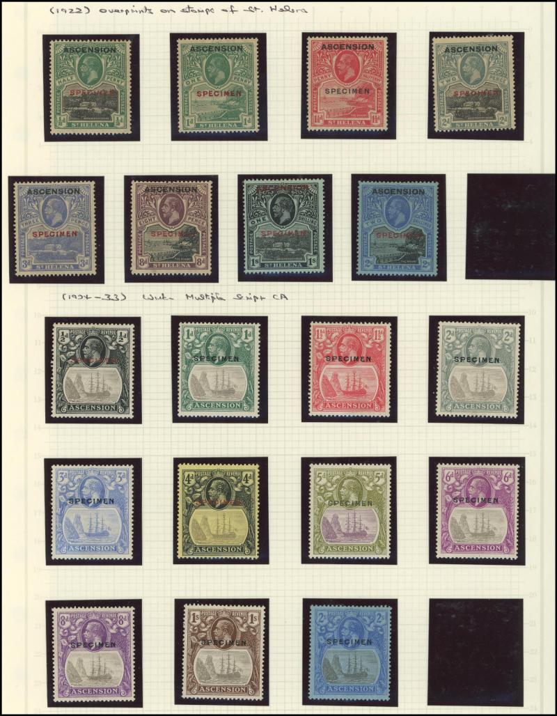 SPECIMEN STAMPS: Selection comprising Overprints on 1922 'ASCENSION' Overprints on St Helena & 1924-33 KGV Badge sets and Horseshoe