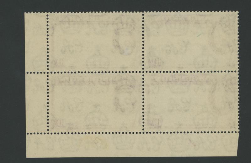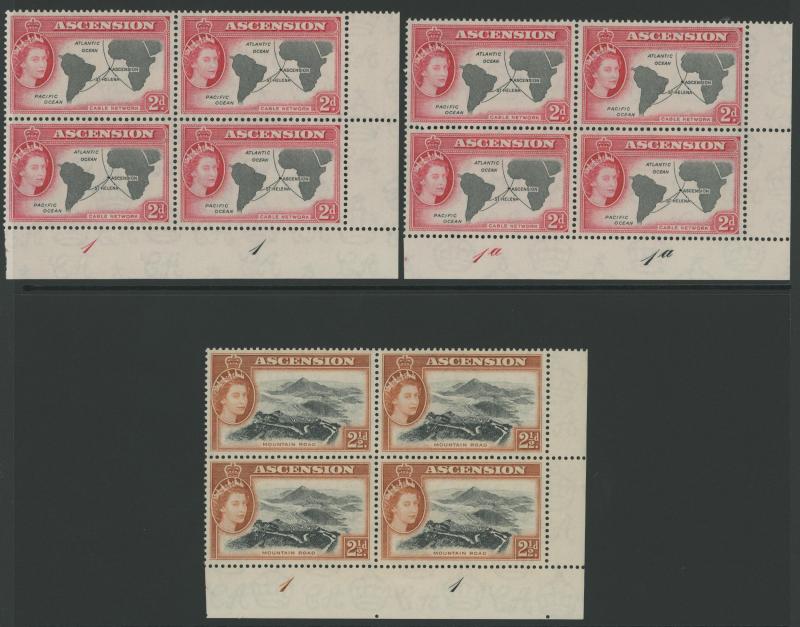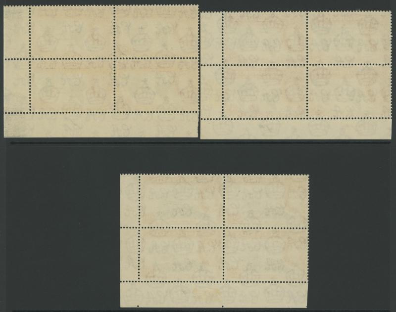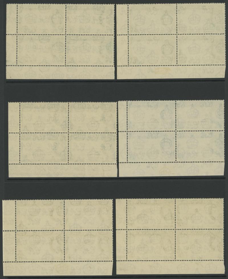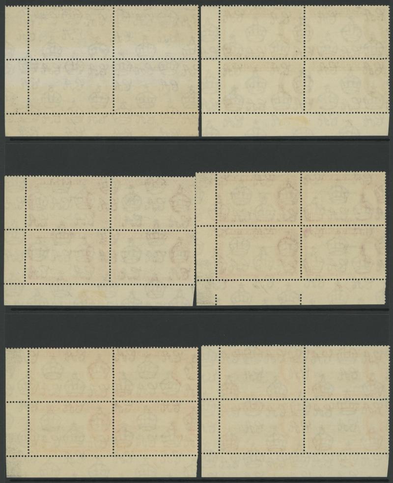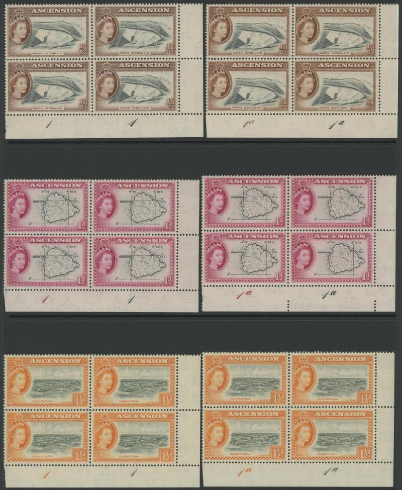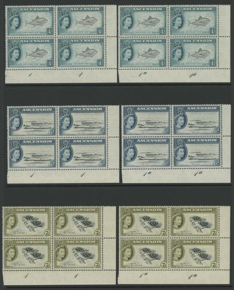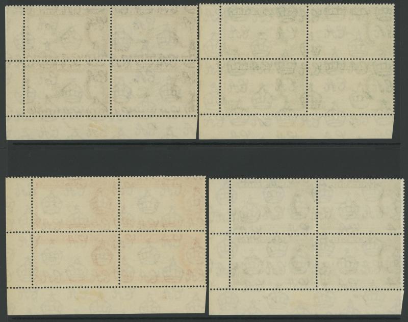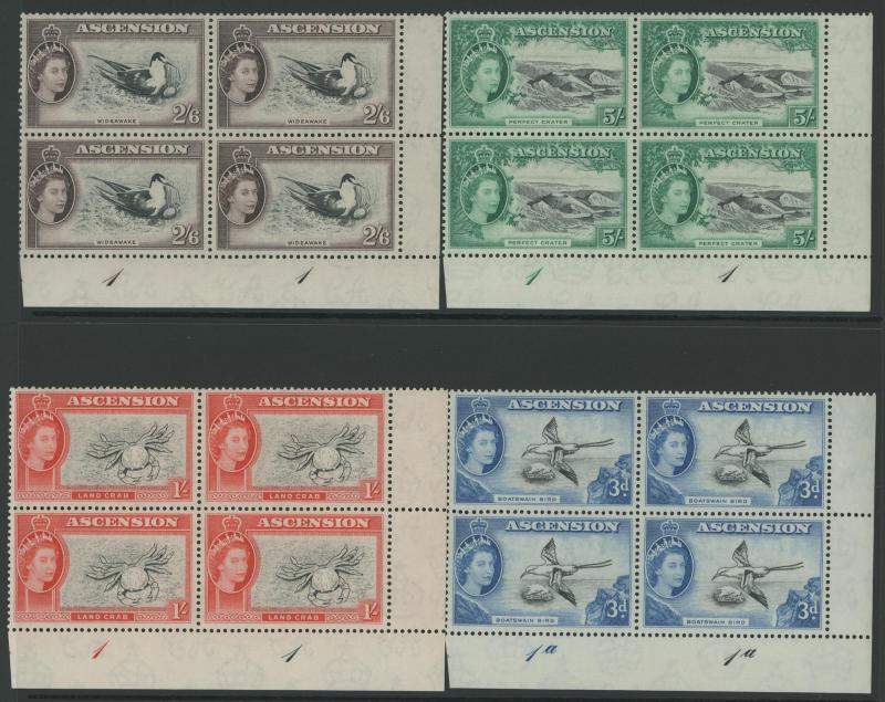 1956 QEII Pictorials ½d to 10/- set SG 57-69 in lower-right corner blocks of 4 with Plate Number '1' or '1a' including both numbers