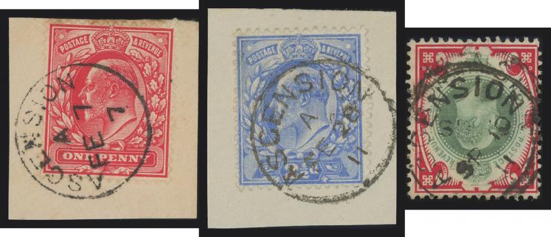 Great Britain used in Ascension KEVII 1d red, 2½d blue & 1/- green & carmine each with largely fine to very fine strikes of