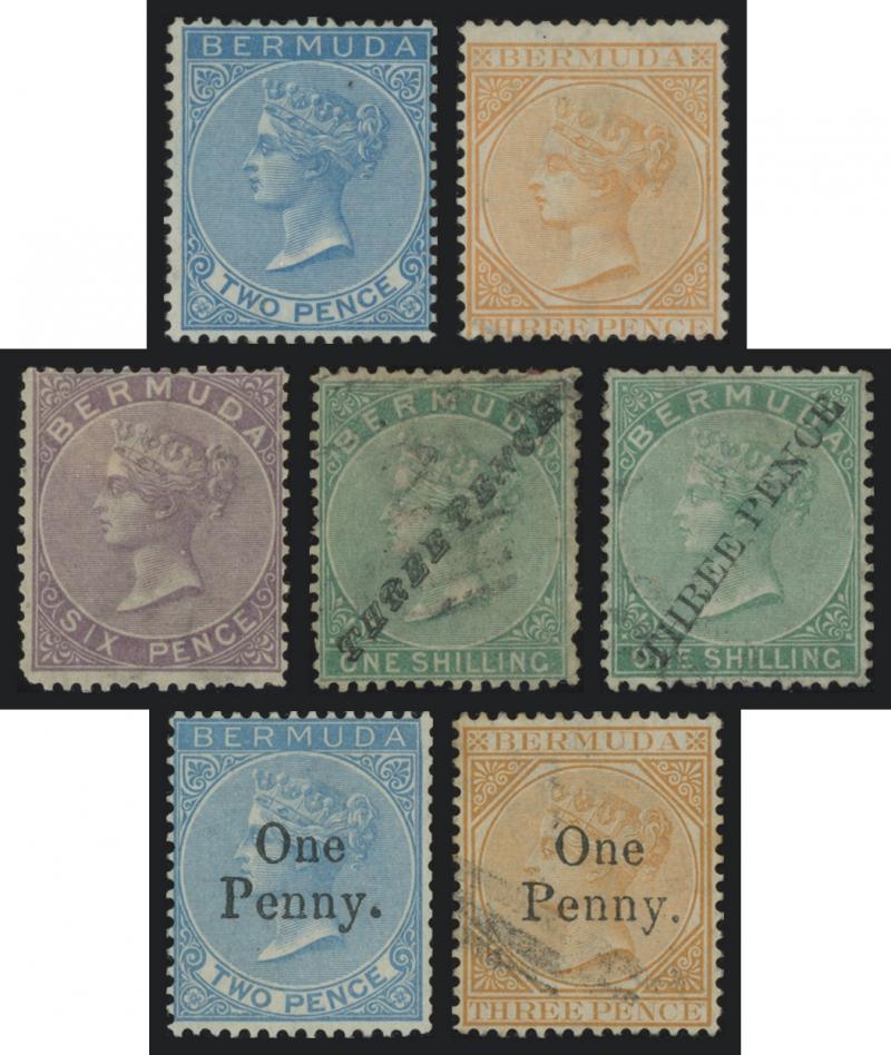(small-part gum; rounded lower-left corner) and 1/- green, 1874 'THREE PENCE' Surcharges Type 6a & Type 7 on 1/- both used with minor faults (the latter with BPA Certificate) and 1875 'One/Penny' Surcharges on 2d blue unused & used, on 3d buff used