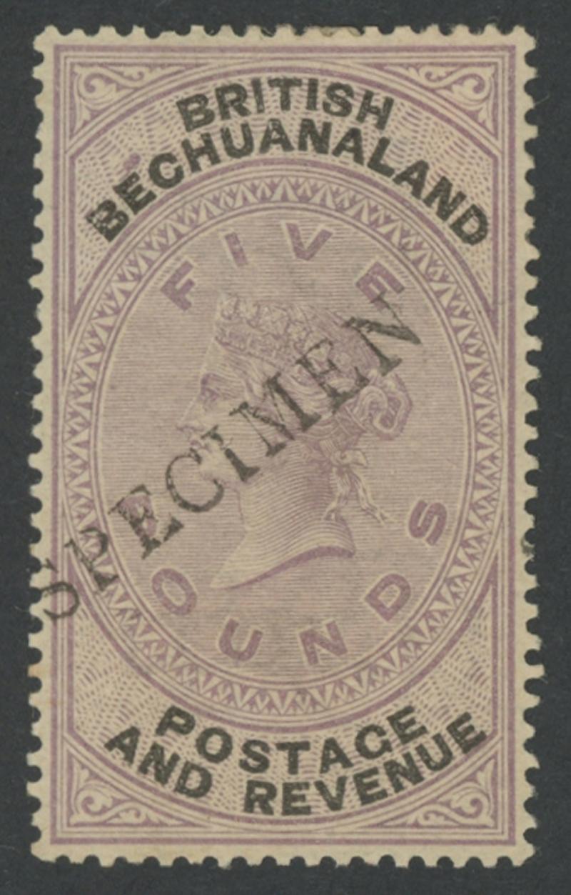 1888 Overprints on Great Britain QV Fiscals Unappropriated Die £5 lilac & black SG 21 with local 'SPECIMEN' handstamp (Samuel type