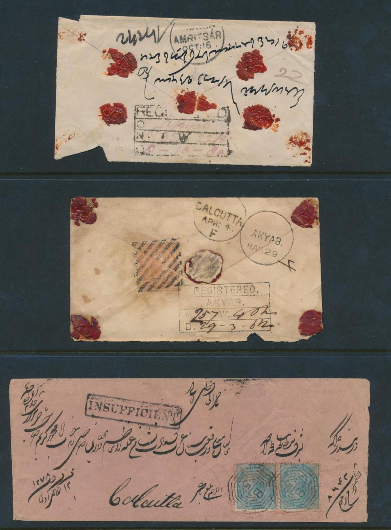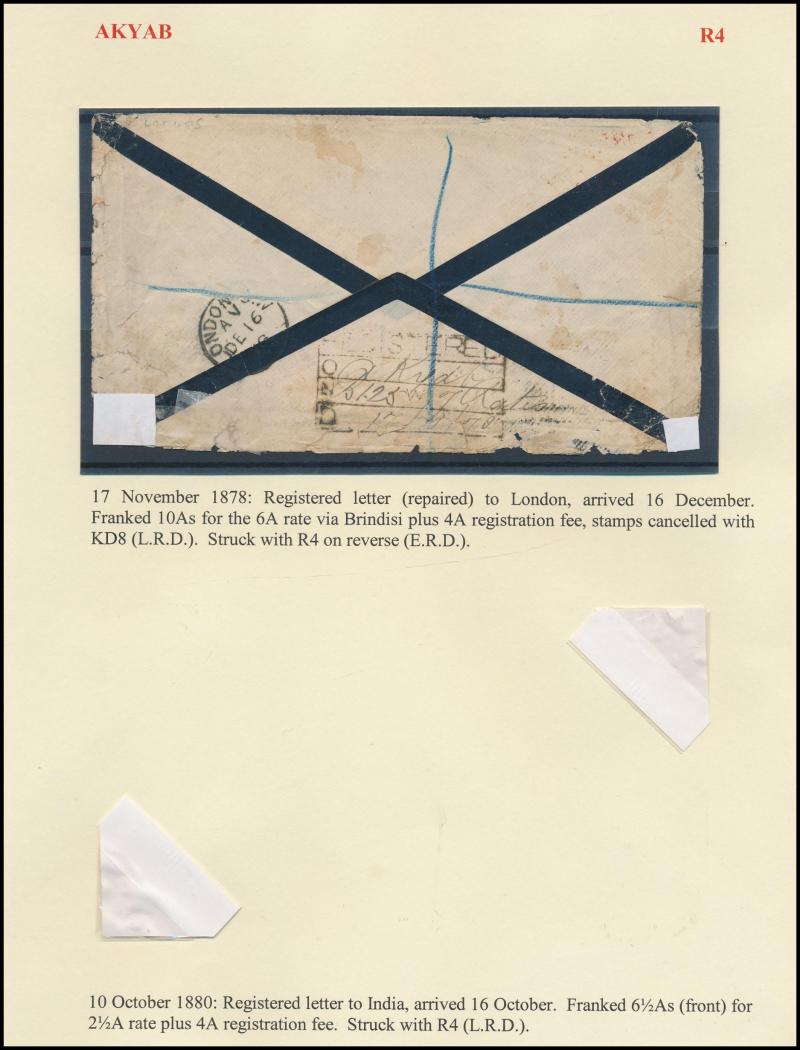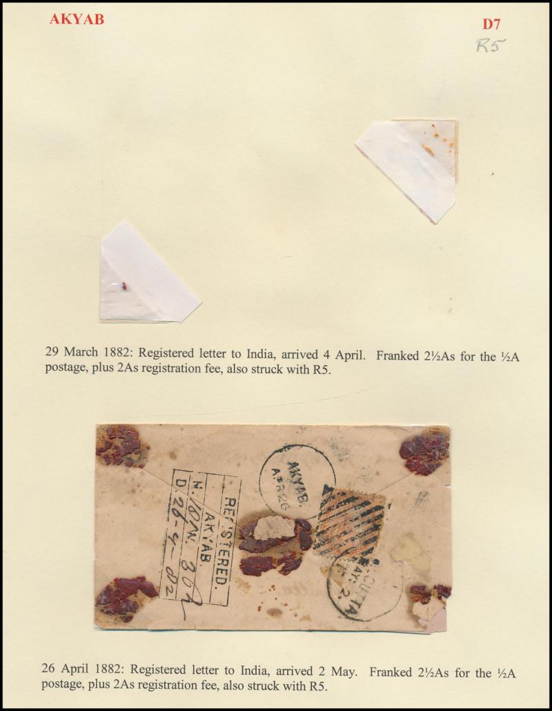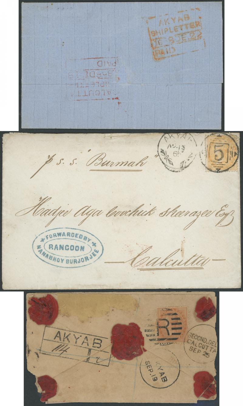 duplex (KD6) & superb 'FORWARDED BY/RANGOON/NANABHOY CURJORJEE' cachet in blue on cover to Calcutta (our vendor paid £325), boxed 'REGISTERED/O ("Akyab")/...' (R4) on 1880 large-part cover, boxed 'REGISTERED/AKYAB/...' (R5) on 1882 cover (faults),