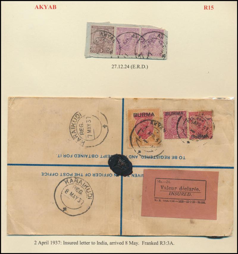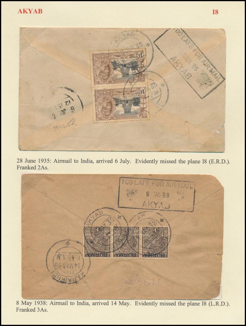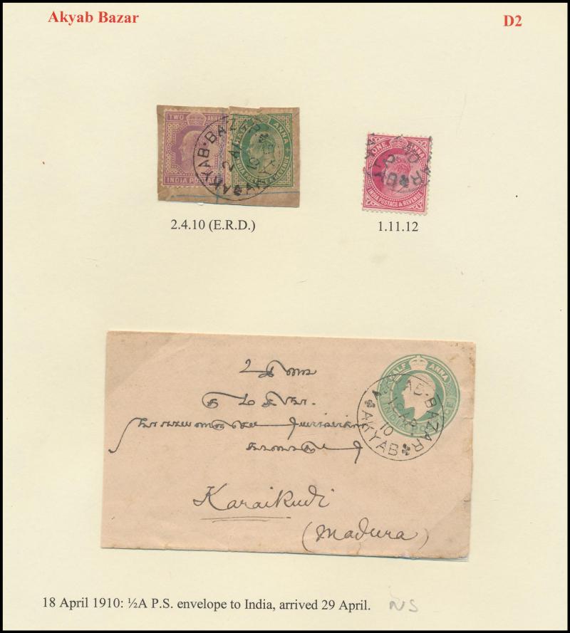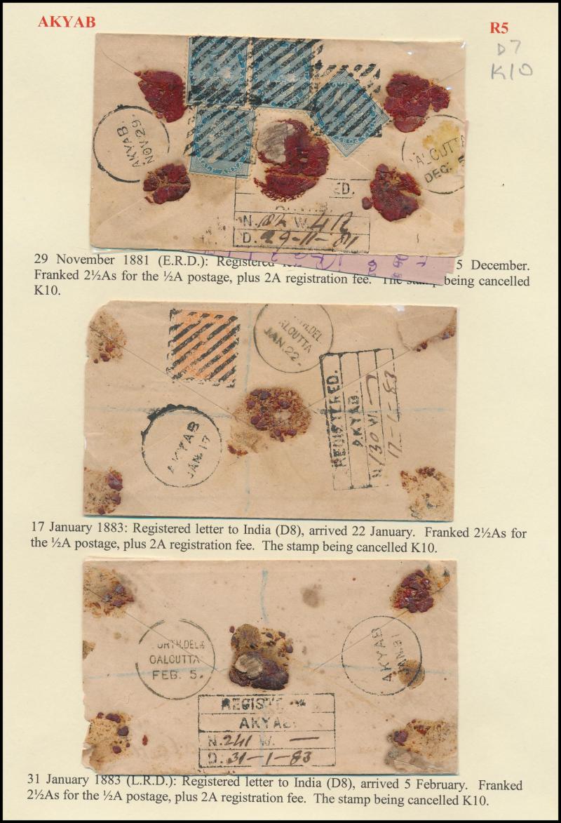 boxed 'AKYAB/...' (R6; recorded by Proud for 9.4.1884 only) superb strike with 'AKYAB/SEP19' cds (no year) on cover (faults), boxed 'TOO LATE FOR AIR MAIL/[date]/AKYAB' on 1935 & 1938 covers, etc, also 'AKYAB-BAZAR/18AP/10/AKYAB' (ERD) very fine on