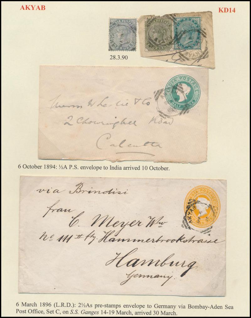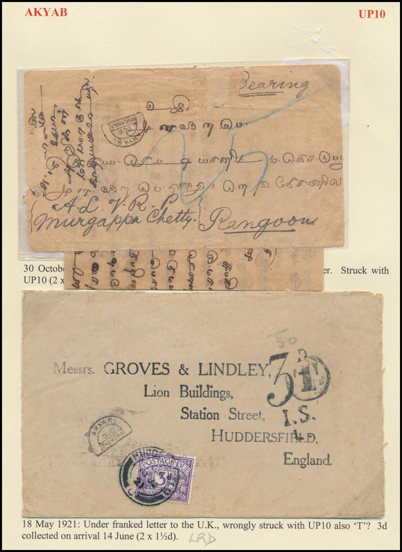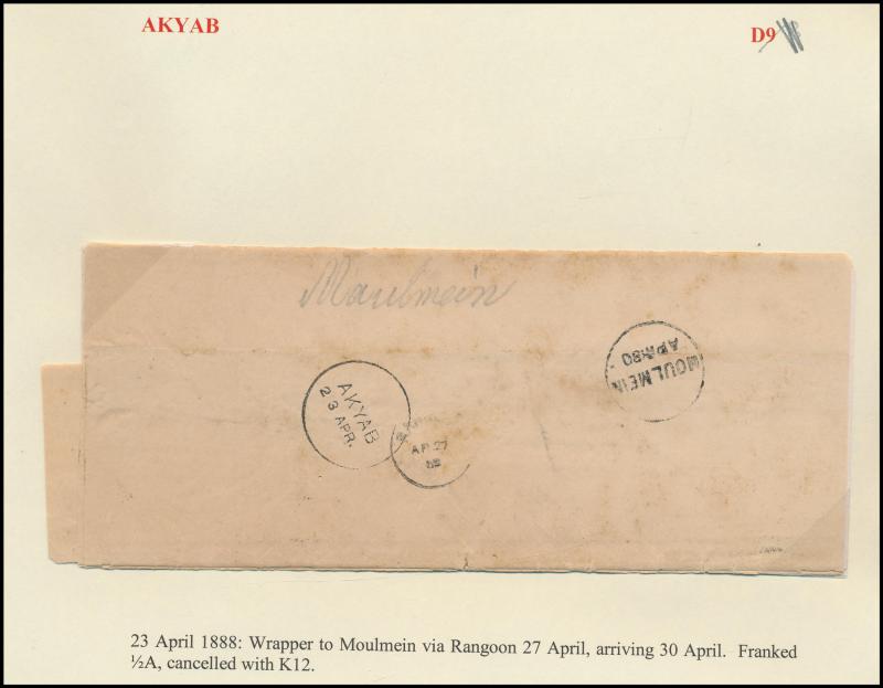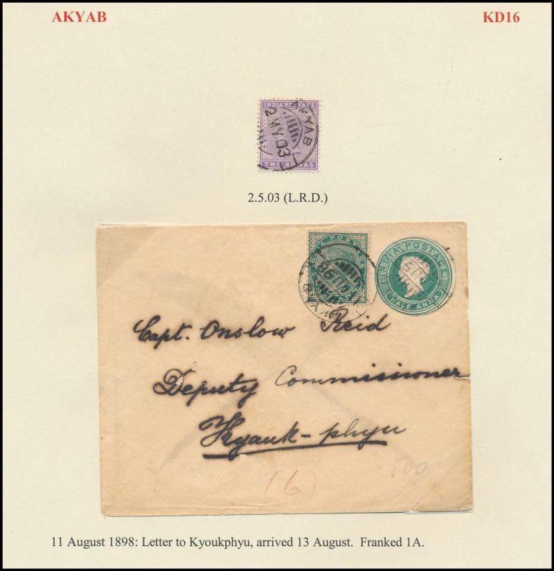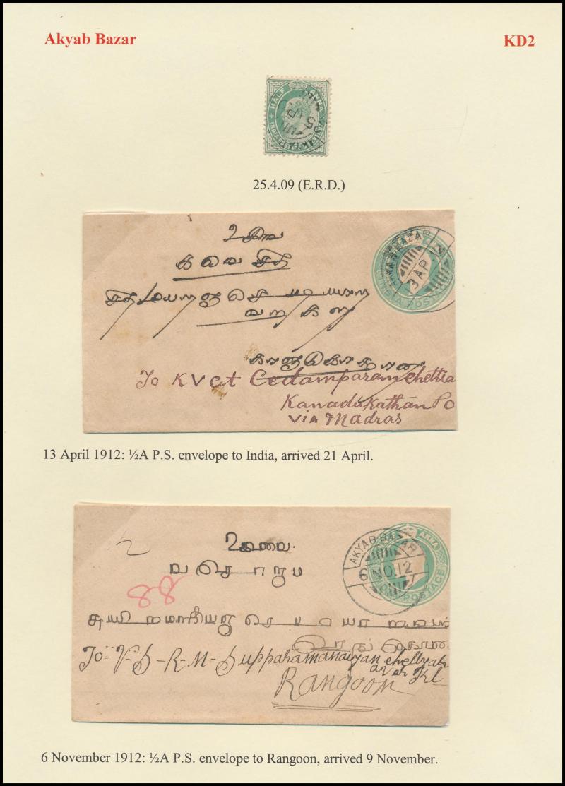 boxed 'AKYAB/...' (R6; recorded by Proud for 9.4.1884 only) superb strike with 'AKYAB/SEP19' cds (no year) on cover (faults), boxed 'TOO LATE FOR AIR MAIL/[date]/AKYAB' on 1935 & 1938 covers, etc, also 'AKYAB-BAZAR/18AP/10/AKYAB' (ERD) very fine on