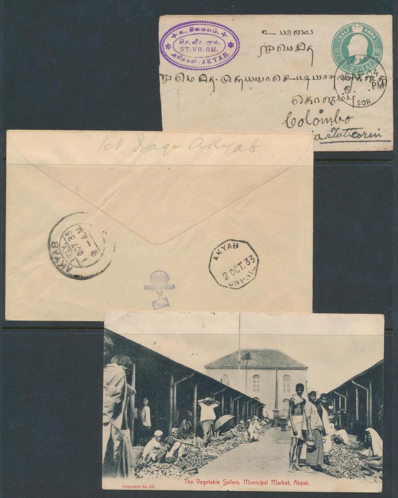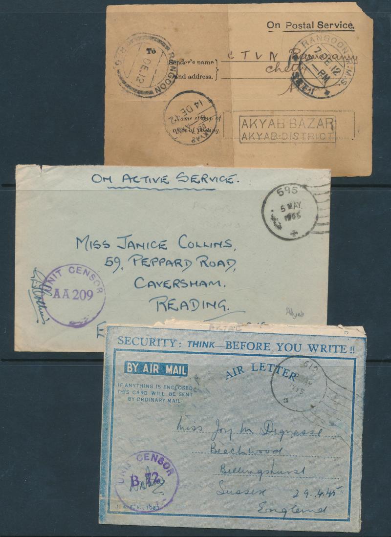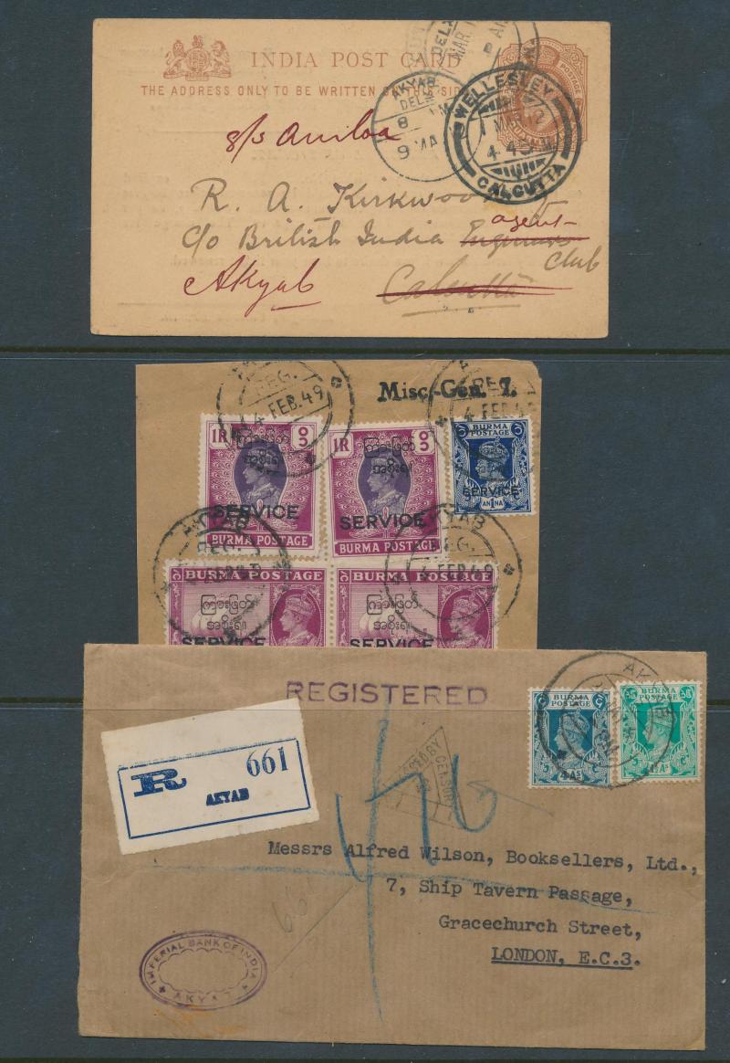 KEVII ½a Envelope, boxed 'AKYAB BAZAR/AKYAB-DISTRICT' very fine on 1912 OPS Postal Card (faults), 1945 covers from Indian FPOs 595 & 612 both based at Akyab, etc, also 1937 Registration Envelope with very fine black/salmon 'Valeur déclarée/INSURED'