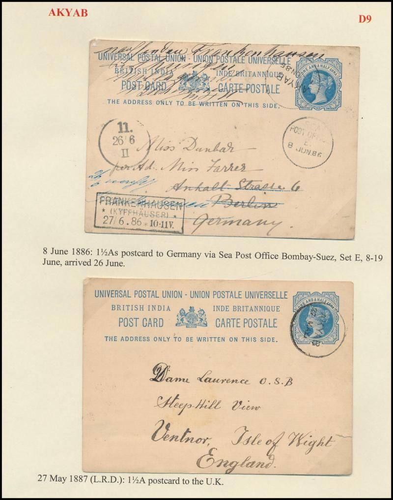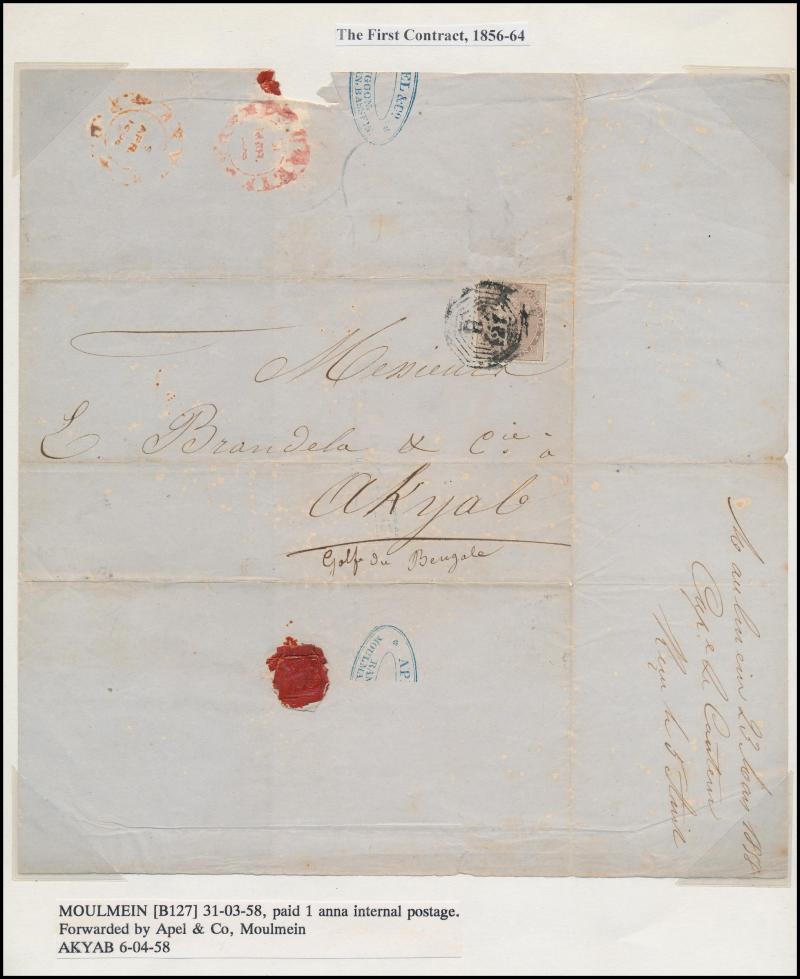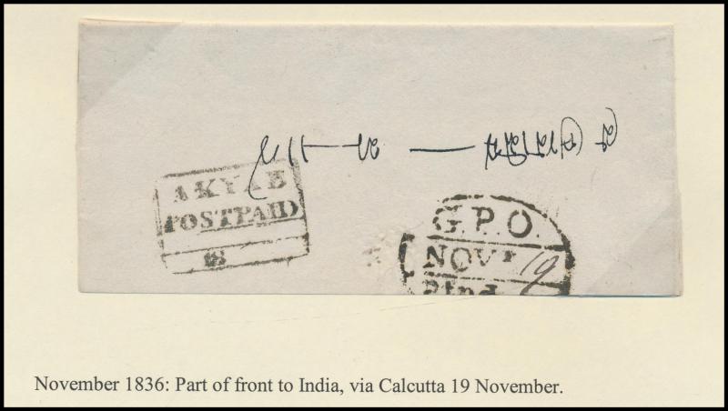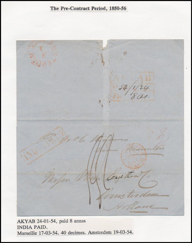 950pp book. Better items include very fine boxed 'AKYAB/POSTPAID/...' on 1836 large piece, boxed 'AKYAB/("54.1.24")/Paid ("8as")' light strike in red on 1854 outer to Netherlands, boxed 'AKYAB/SHIPLETTER/1858DE22/PAID___' (recorded 15 months only)
