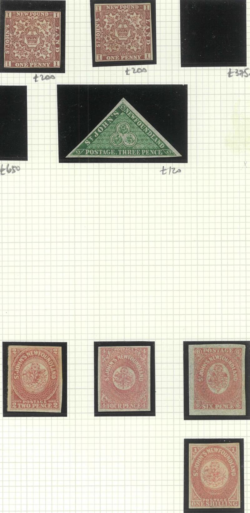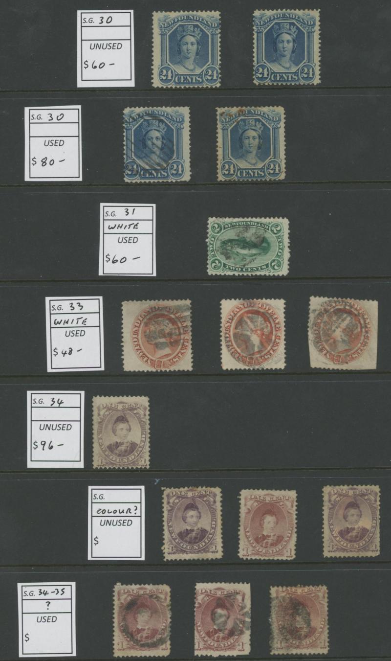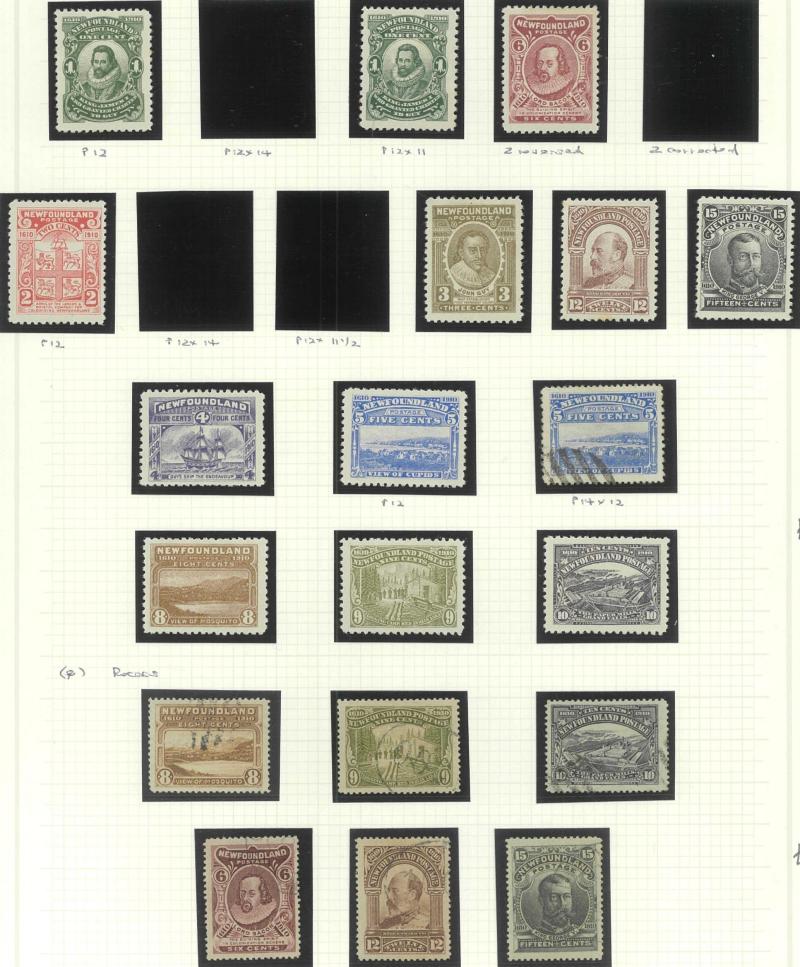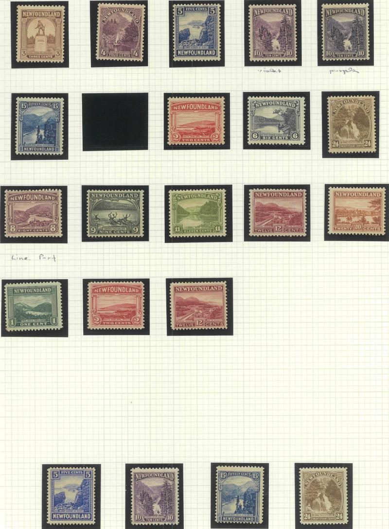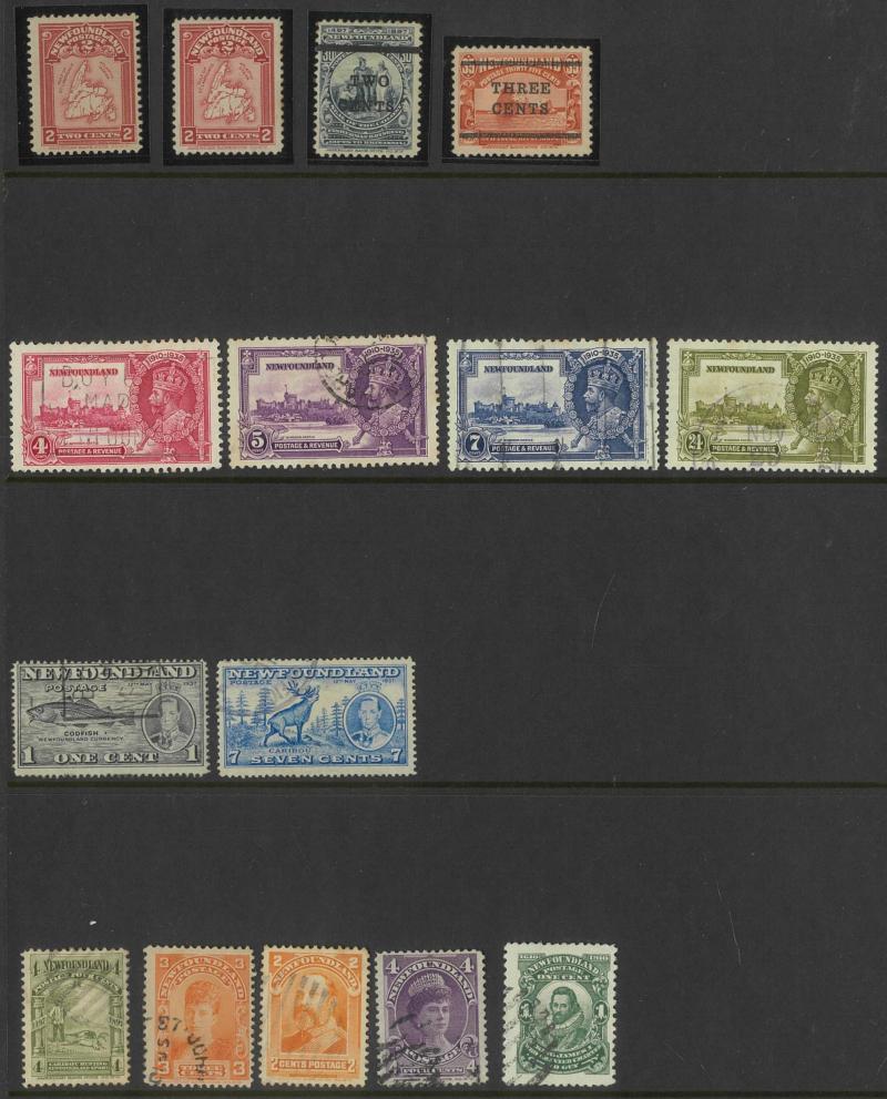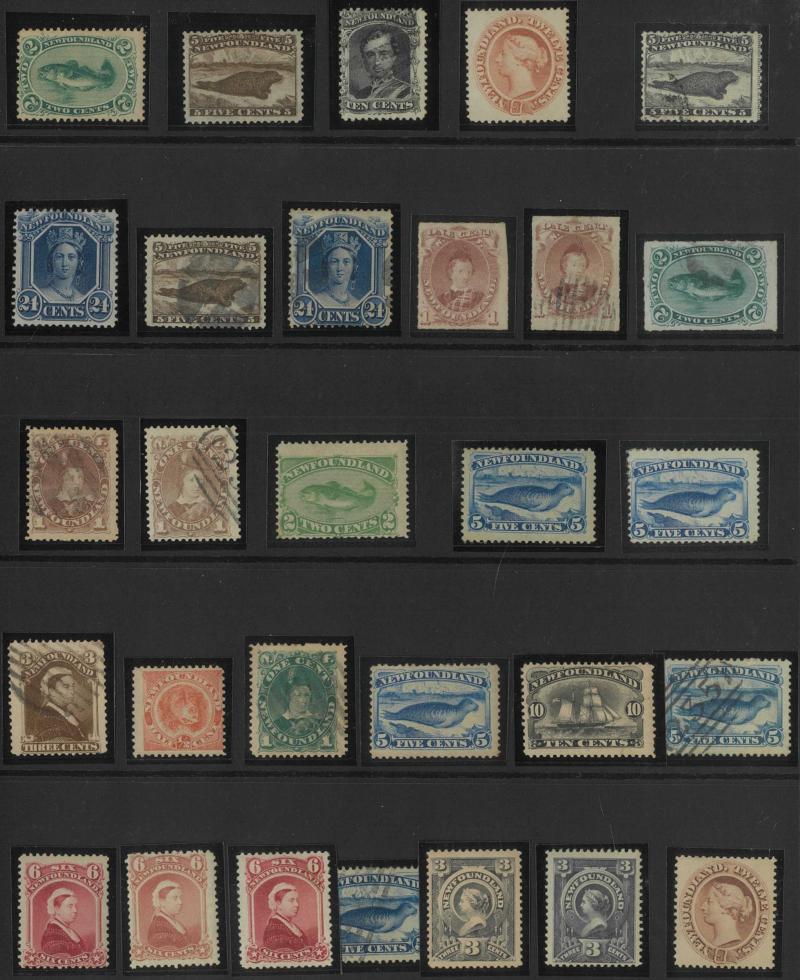 NEWFOUNDLAND: 1860s-1940s collection on leaves from Crown & Flowers Imperforate 1d x2, 2d, 3d & 5d plus 1862-64 New Colours 2d, 4d,