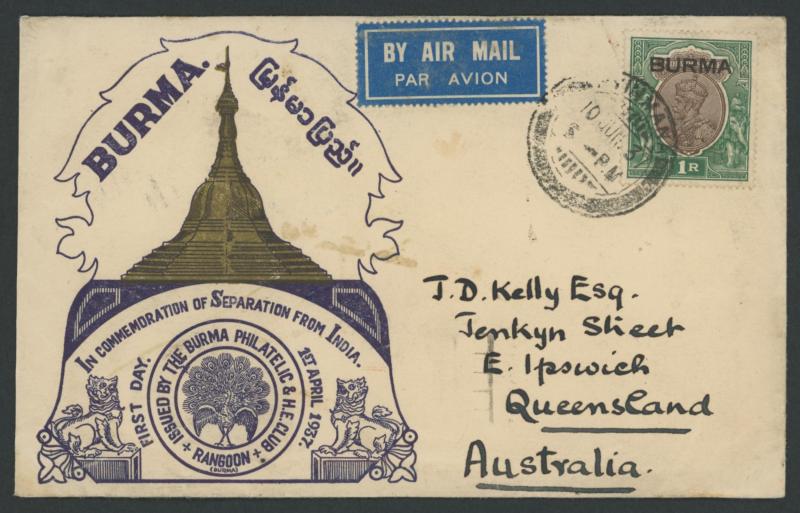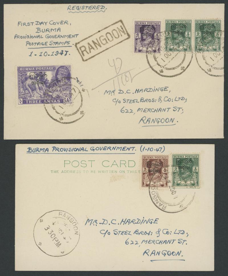 'KANDAWGLAY-RANGOON' or 'EXPERIMENTAL PO/R-516' (vertical fold), two philatelic covers with cds of 'KYONPYAW' or 'MANDALAY'; also 1937 Separation from India cover by air to Australia with Overprints 1r, and 1947 Provisional Overprints two philatelic