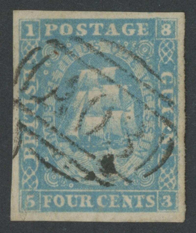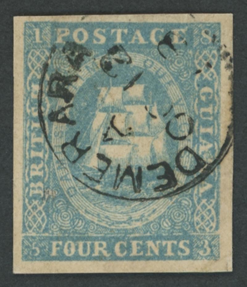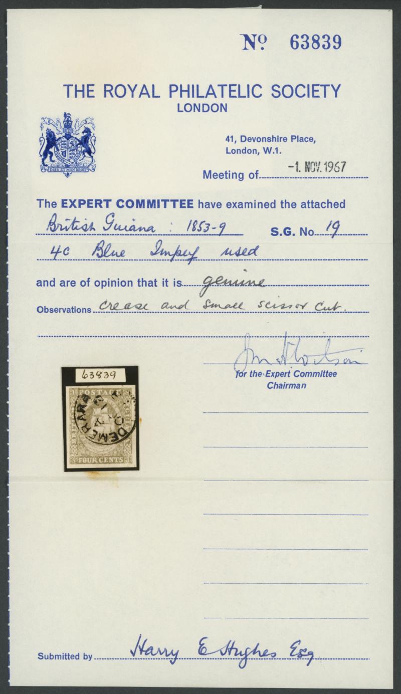 'DEMERARA/OC 12/58' cds cancel, Cat £800. RPSL Certificate (1967) mentions a crease (which we cannot discern) and a small scissor cut, which is in the margin at lower-right clear of the design. (Image1) (Image2)