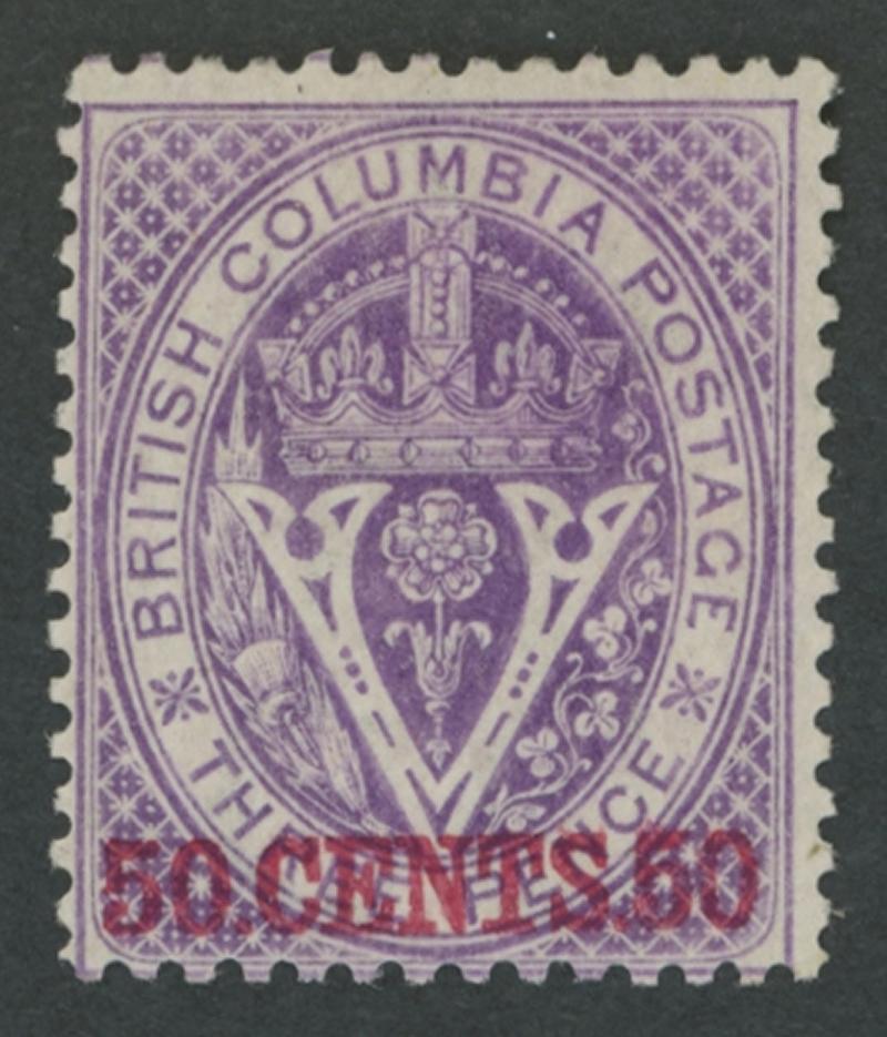 BRITISH COLUMBIA: 1868-71 Surcharges Perf 14 '50.CENTS.50' in Red on 3d mauve SG 32 (Scott 12), large-part gum, Cat £1000