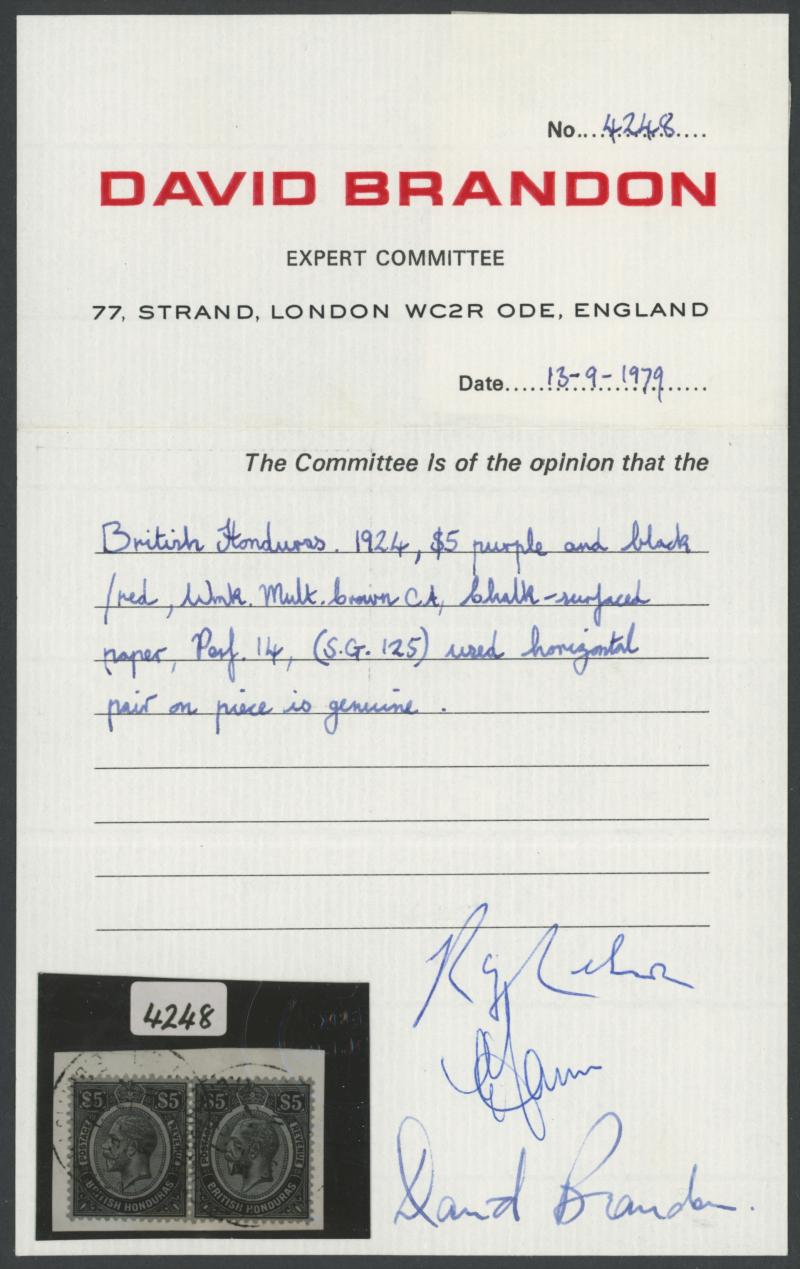 by Belize cds cancels, Cat £650+ for singles. David Brandon Certificate (1979). (Image1) (Image2)