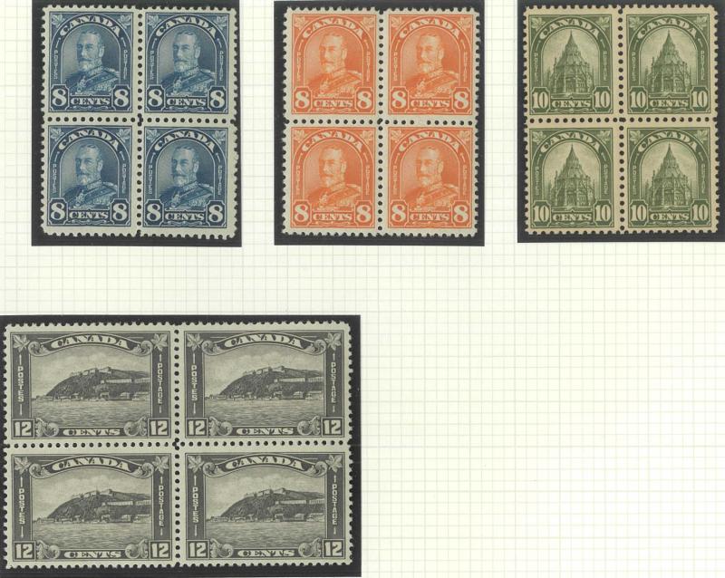 incomplete unused to $1 & used to $2 (faded), KEVII 50c mint (egregious centring), Quebec Tercentenary sound set, useful Admirals including 1922-31 1c 2c & 3c Imperf Blocks of 4 (*/**), 50c Bluenose x8; etc, condition variable but many are fine to