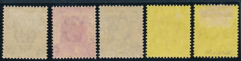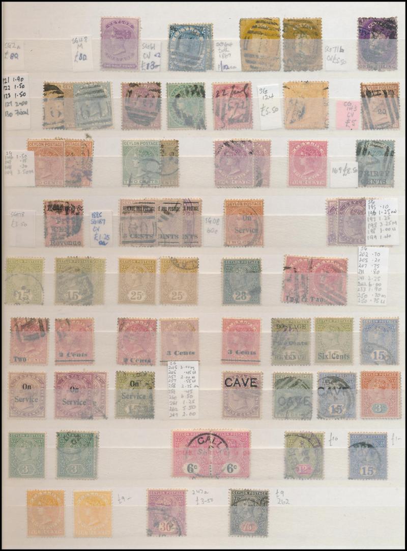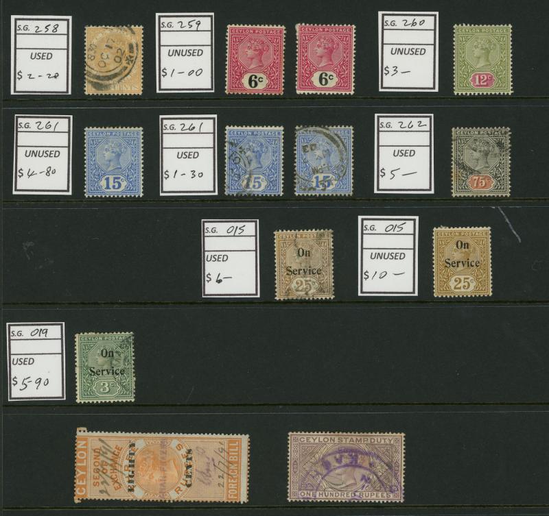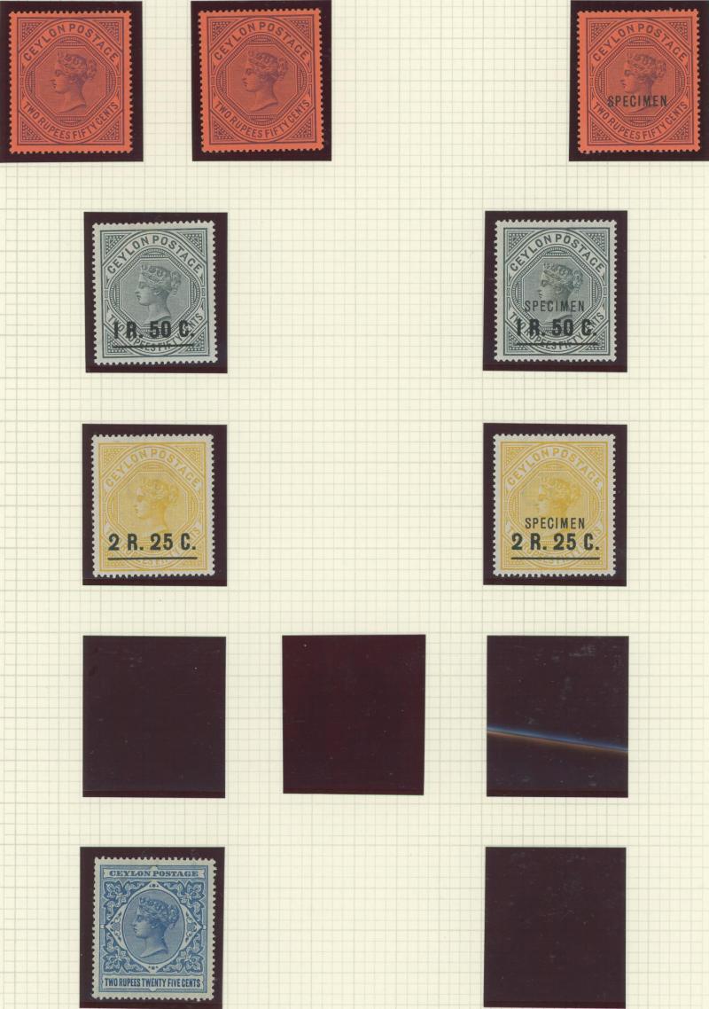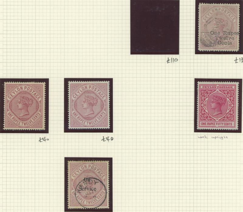 QV Crown/CC Wmk 1r12c x2 and with 'On/Service' overprint used, 1893-99 2r50c purple/red x2 and 1898-99 '1R.50C' & '2R.25C' overprints plus all three with 'SPECIMEN' overprint, 1899-1900 1r50c red & 2r25c blue, also including 1903-05 KEVII Keyplates