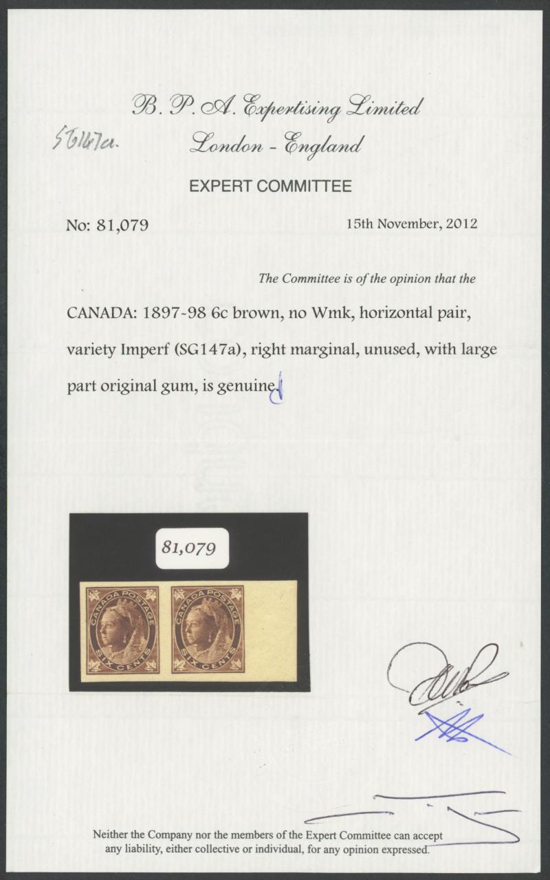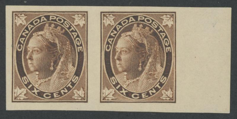 1897 Queen Victoria Maple Leaves 6c brown Imperforate Horizontal Pair SG 147a (Scott 71a) with sheet margin at right, very lightly