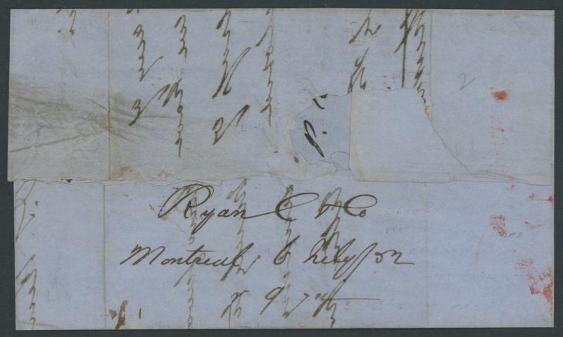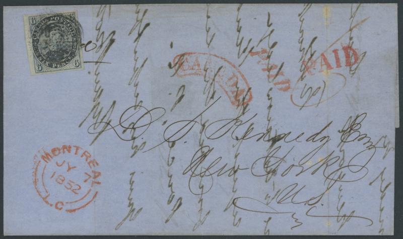 by concentric rings cancel, very fine 'MONTREAL/L.C.' split-ring cds in red below, curved 'CANADA' handstamp and two different 'PAID' cachets alongside all in red, docketing on reverse, some ink 'bleed' through the face, Cat £1200+ for used (US$2000