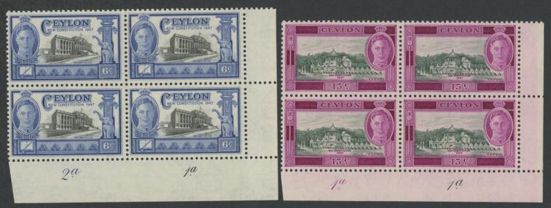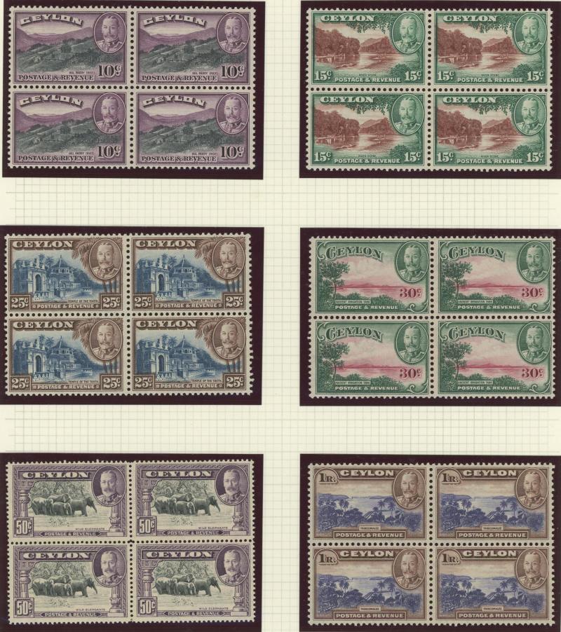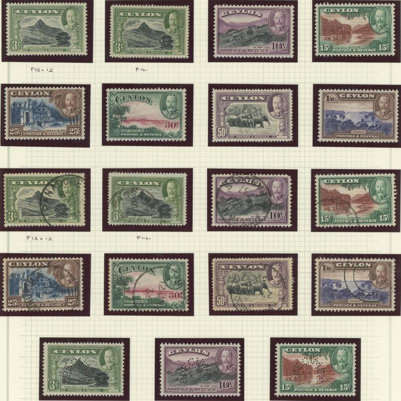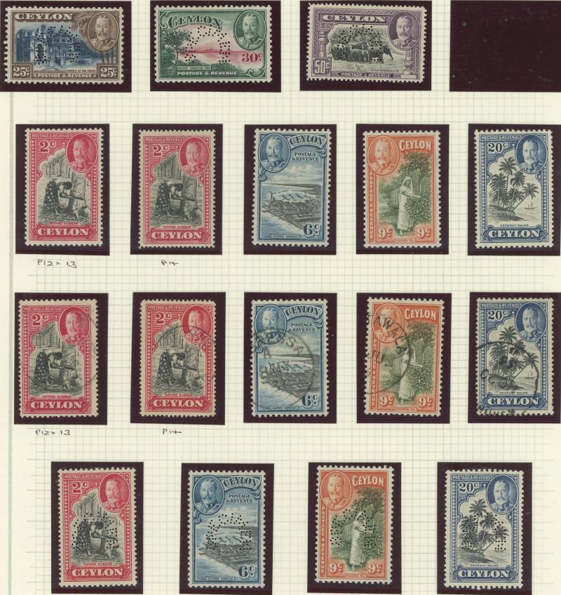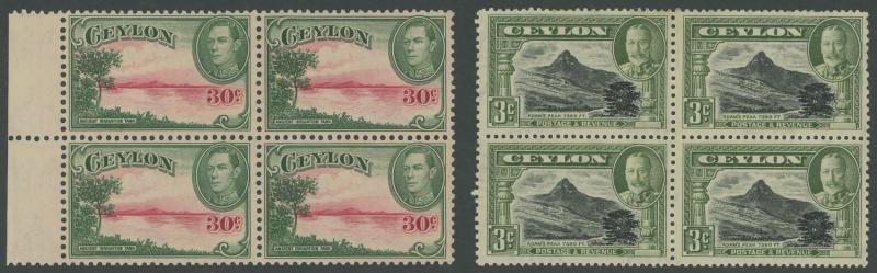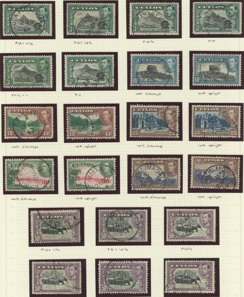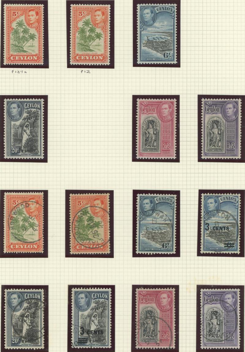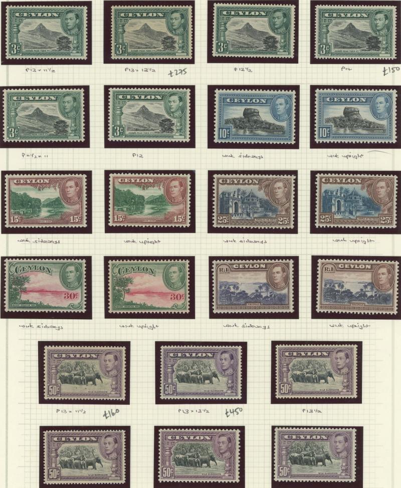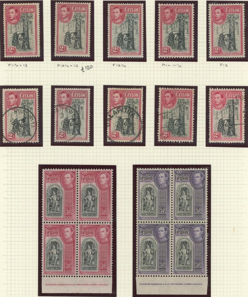 Perf 13x11½ 50c, Perf 13x13½ 2c, 3c & 50c and Line Perf 14 3c & 50c and similar used as well as 2r (both) imprint blocks of 4 **, then KGVI Heads 5r Chalk-Surfaced Paper single & block of 4 **, Ordinary Paper single ** plus two extra shades * and