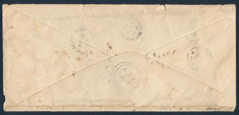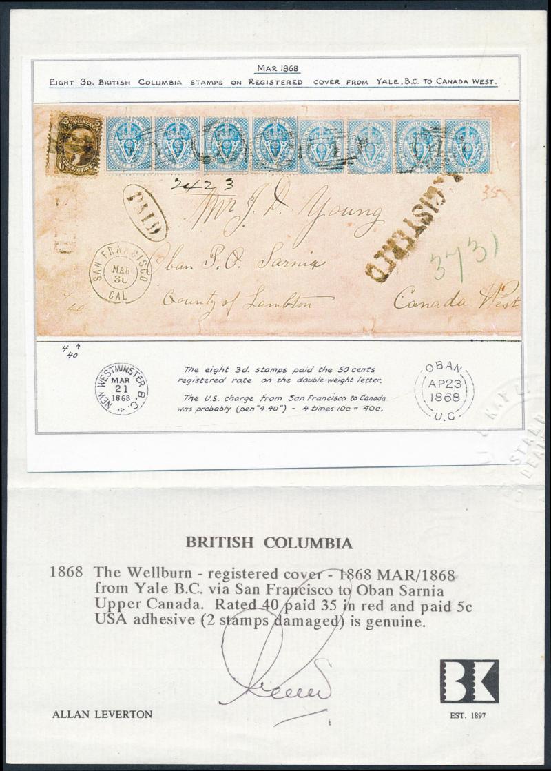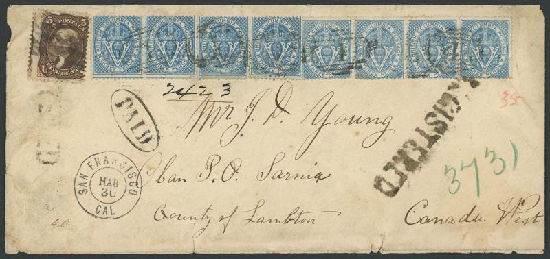 Transcontinetal Railways, the item was carried ship to San Francisco, stagecoach & railway across the USA to Michigan, across the border at Sarnia and onwards by rail. An exceptional combination franking item. Ex Gerald Wellburn. Allan Leverton