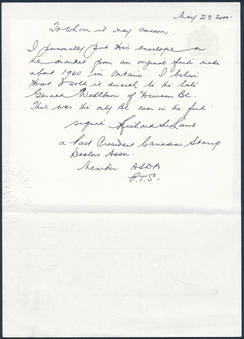 Certificate (2000) with additional note "... from an original find made about 1960 in Ontario ... this was the only BC cover in the find" signed by Richard Lamb. (Image1) (Image2)