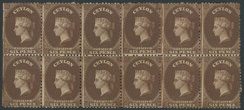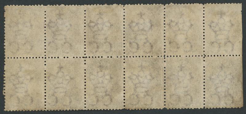 1867-70 Wmk Crown/CC 21½ mm High 6d red-brown SG 67c block of 12 (6x2), perfs at left trimmed clear of the design, ironed-out