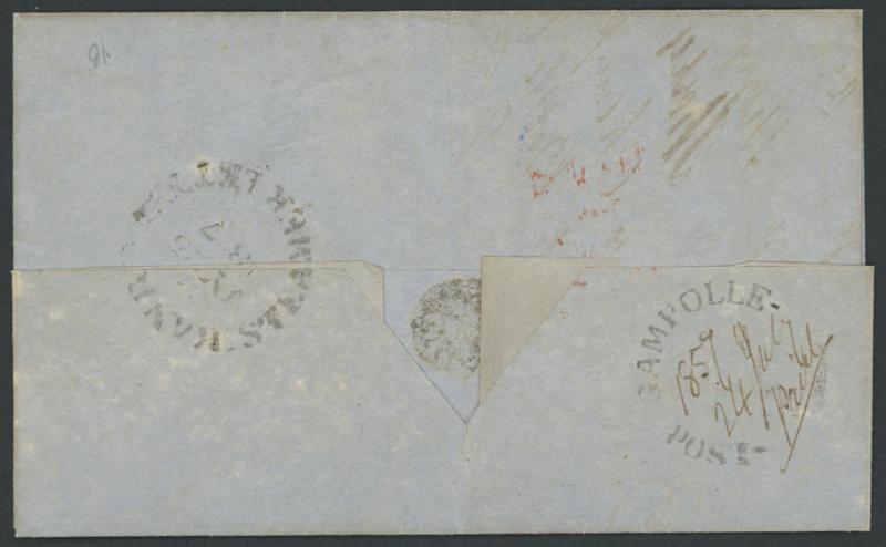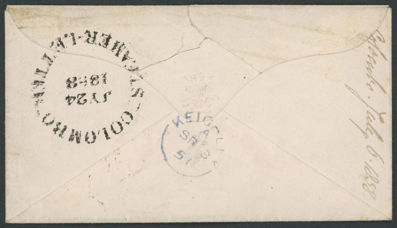 backstamp in blue, very attractive. A beautiful Number One cover. Joseph Hackmey's almost identical cover from the same correspondence - with docketing on the face - sold in 2010 for US$5400. 'Besancon' had no SG 1 cover. (Image1) (Image2)