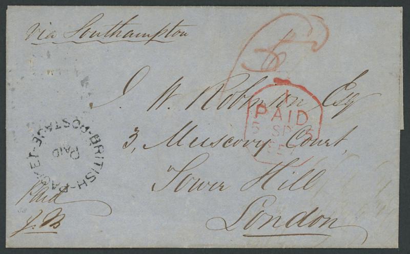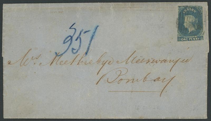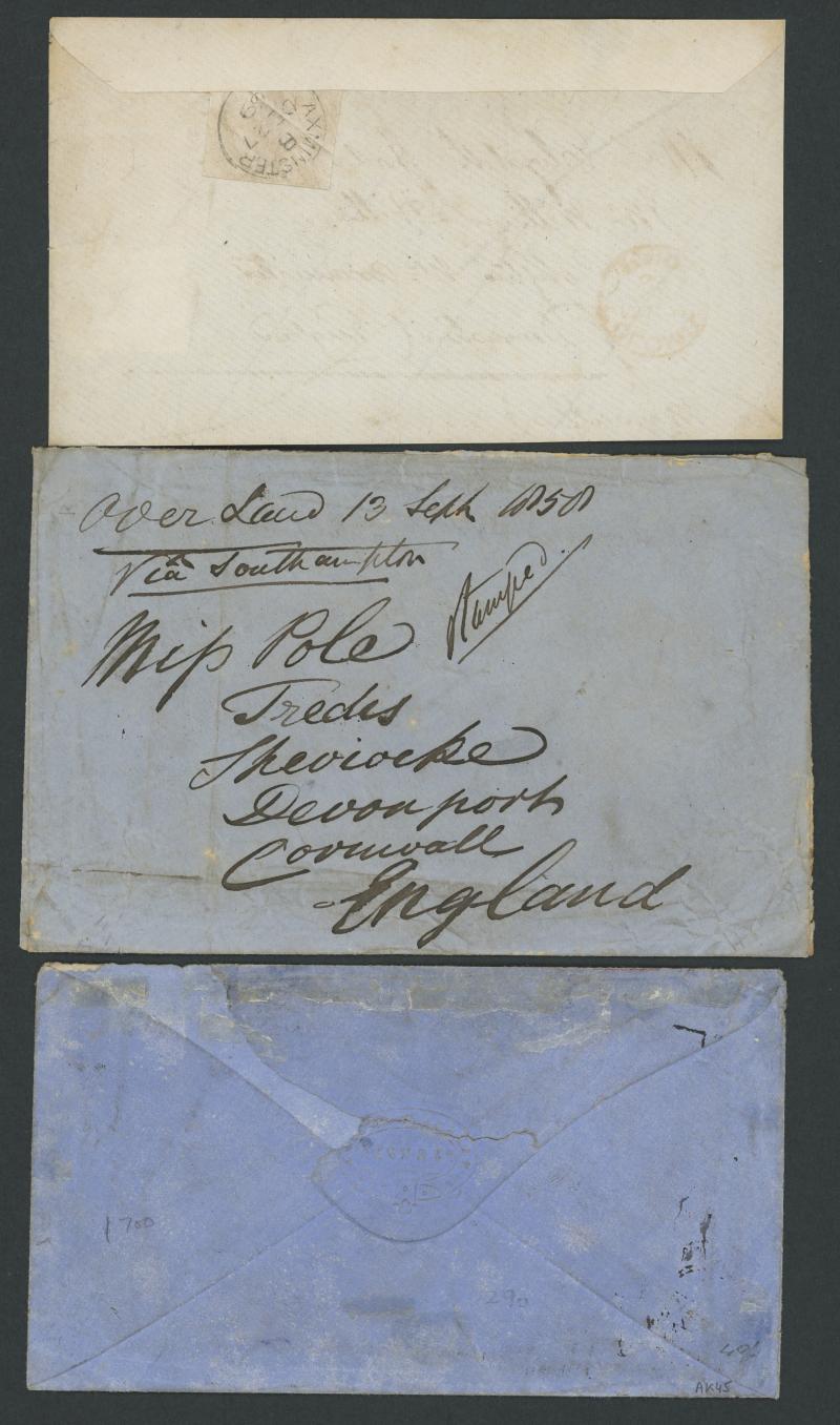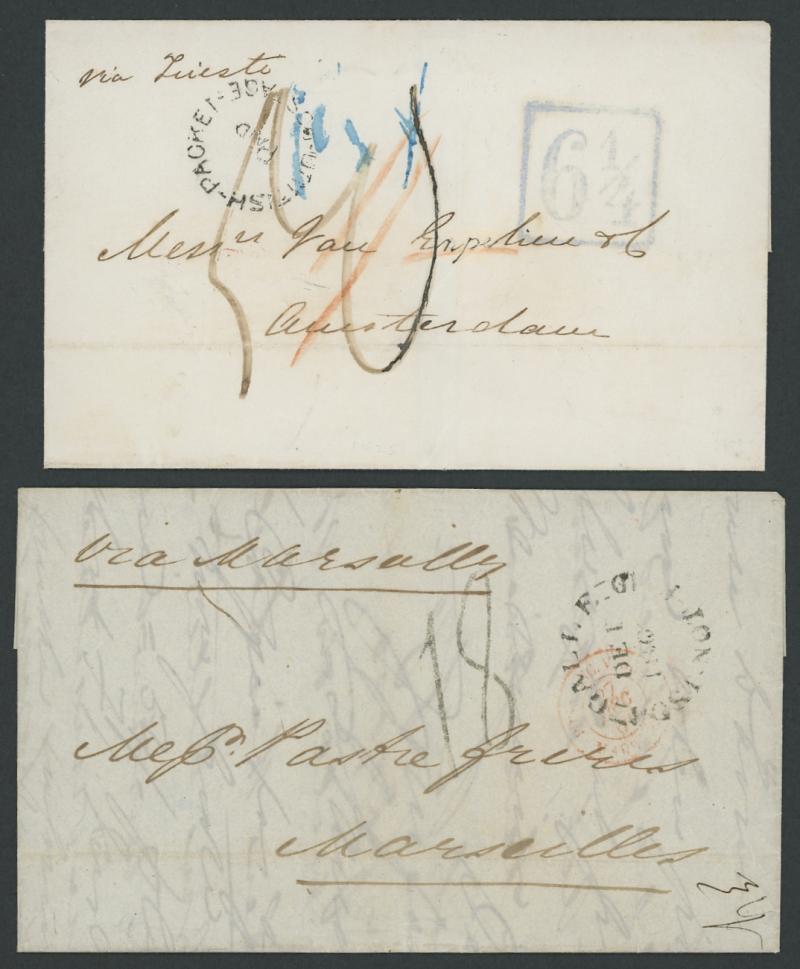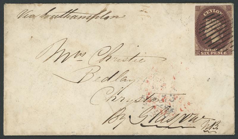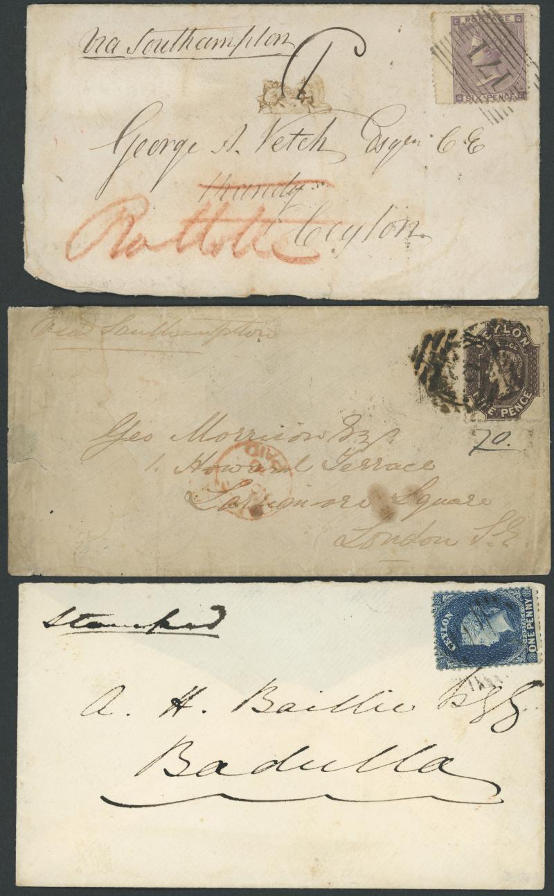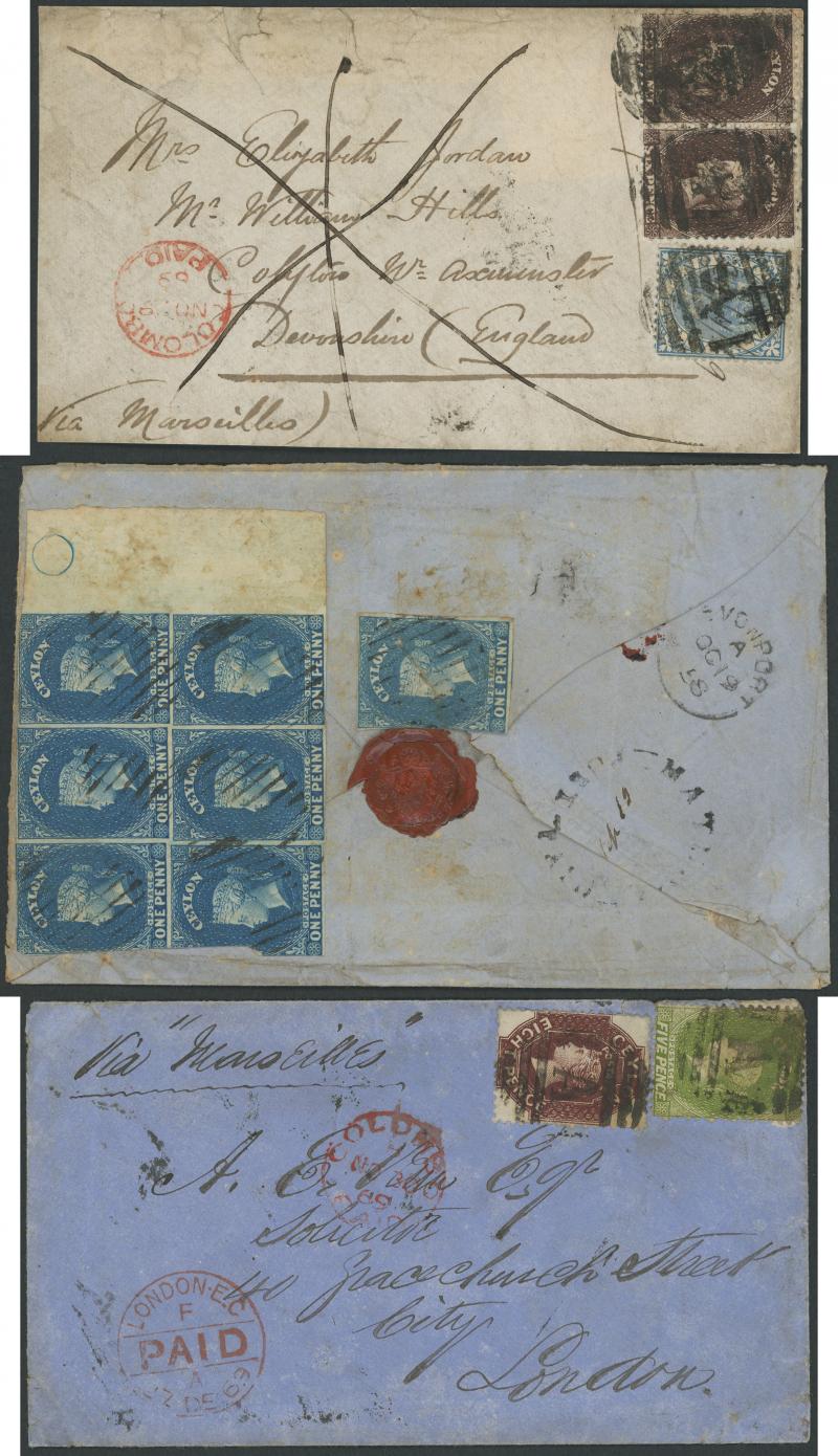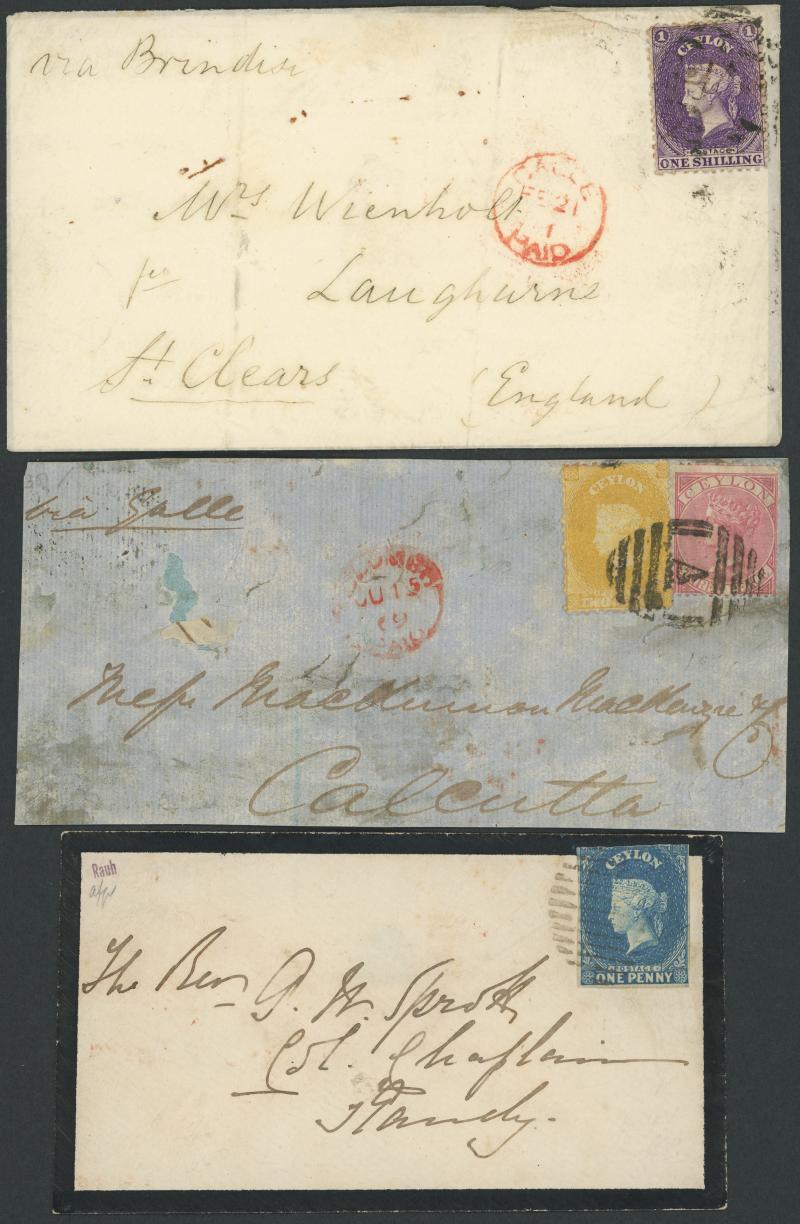 arrival cds in red; 2) 1857 part-entire to England, the reverse with 'GAMPOLLE/POST-____' ('NOT PAID' removed) & manuscript "1857/24/July/Paid" inserted and 'KANDY/=STEAMER-LETTER=' cds; and 3) 1861 entire to France with 'GALLE/=POST-NOT-PAID=' cds &