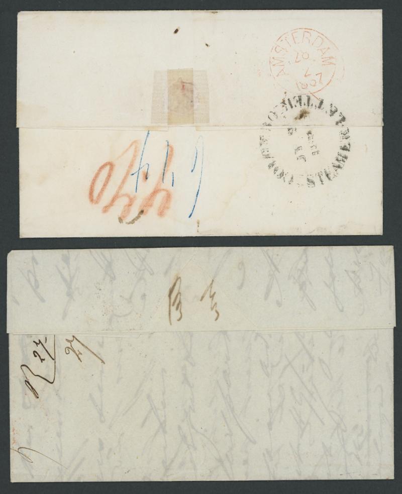 1857-61 stampless trio comprising 1) 1857 outer to the Netherlands, the reverse with large 'COLOMBO/=STEAMER-LETTER=' & 'AMSTERDAM'