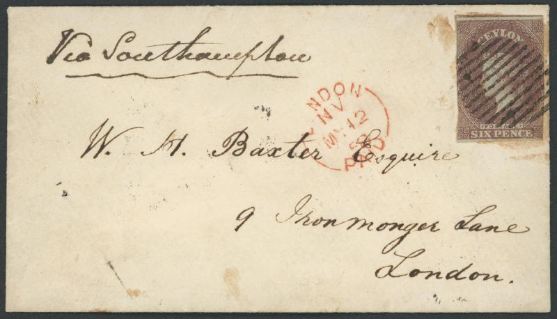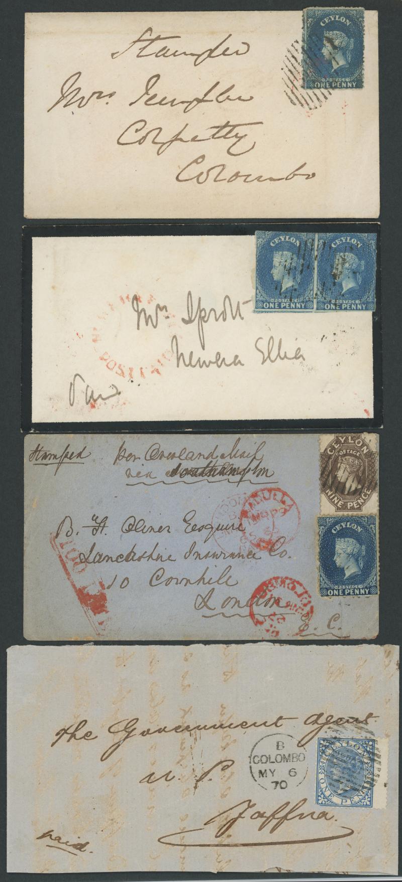 (damaged on opening) and marginal block of 6 (cut-into at left) on the reverse with rare 'MATURA/=POST-PAID=' handstamp (Proud PD2; no dates recorded); 1861 1d & 2d double-rate mourning covers with poor 'NUWERA ELIYA' & 'KANDY' handstamps; 1864 from