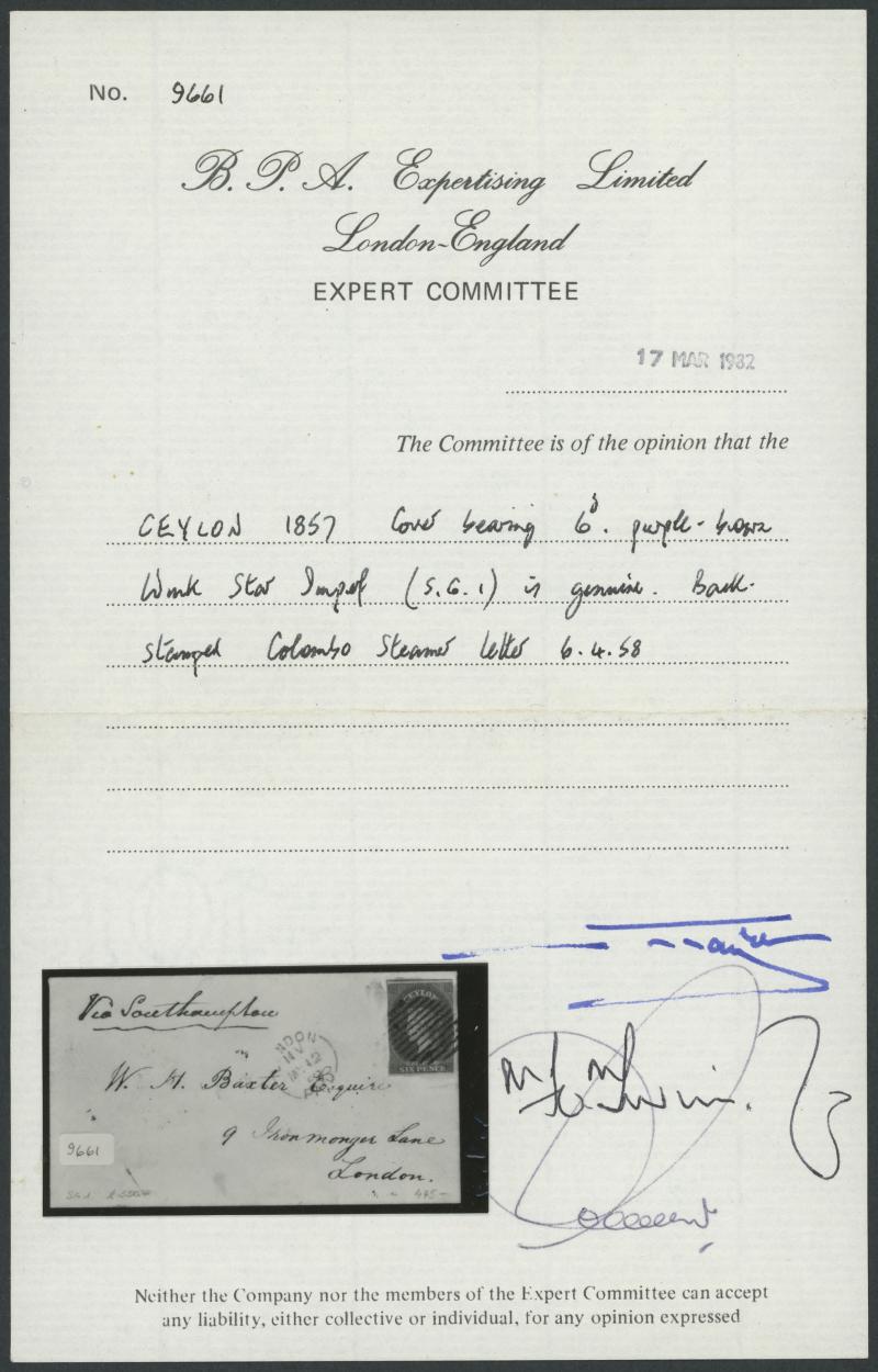fragment of the adjoining unit above; Cat £450 x5 on cover) tied by very fine bars cancel & large 'COLOMBO/AP6/1858/STEAMER-LETTER' backstamp, 'LONDON/ NV /MY12/58/PAID' cds in red on the face, minor blemishes. BPA Certificate (1982). (Image1) (Image2)