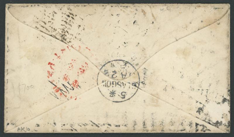 x4+ on cover) just tied by bars cancel, the reverse with poor partial '.../DE6/1859/POST-PAID' cds in red & ' 5* /GLASGOW/JA22/60' arrival cds, minor soiling. (Image1) (Image2)