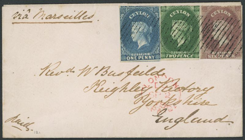 purple-brown/blue, 1d blue & 2d green SG 1 2a & 3 (all with margins in places; Cat £600 x4+ on cover), very fine 'COLOMBO/JY24/1858/=STEAMER-LETTER=' backstamp, small 'LONDON/ EU /SP2/58/ PAID' cds in red on the face & 'KEIGHLEY/SP3/58' arrival
