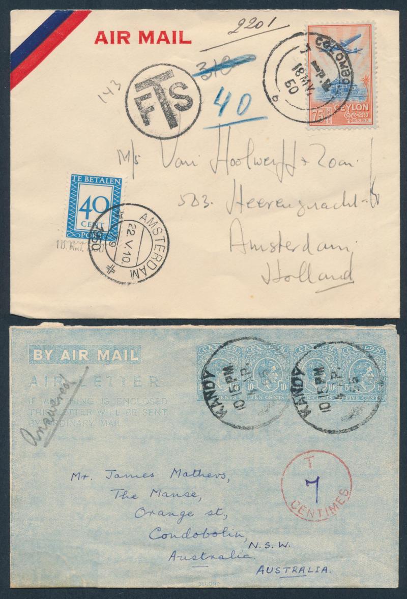 with Postage Dues of Australia, Canada x2, France, GB x3, Holland & South Africa, also 1952 to Sweden & 1953 to USA both with 'INSUFFICIENTLY PAID FOR/...AIR SERVICE' cachet, generally fine to very fine.