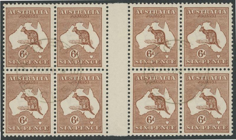 6d deep chestnut SG 73 gutter block of 8 (4x2) CTO with 'GPO/MELBOURNE' 28mm cds ACSC 21Cw, deep rich shade, variable centring, Cat