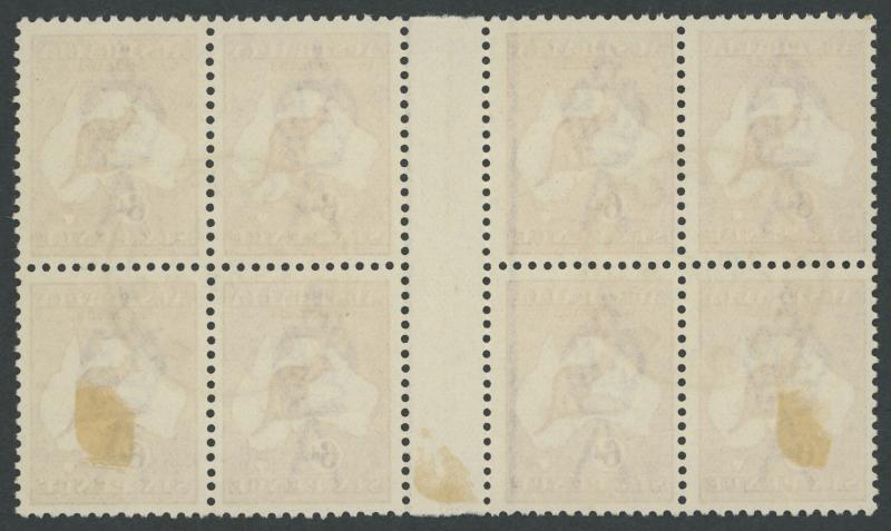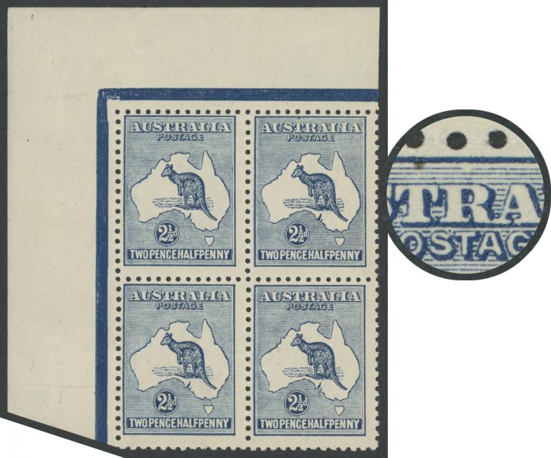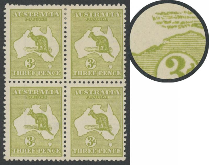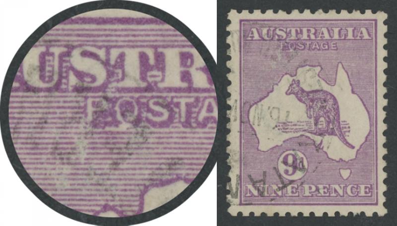 above 'R' of 'AUSTRALIA' [Pos 1L2] ACSC 11A(1)d, unmounted, Cat $475+ for the variety mounted and three unmounted singles. (Image1) (Image2)