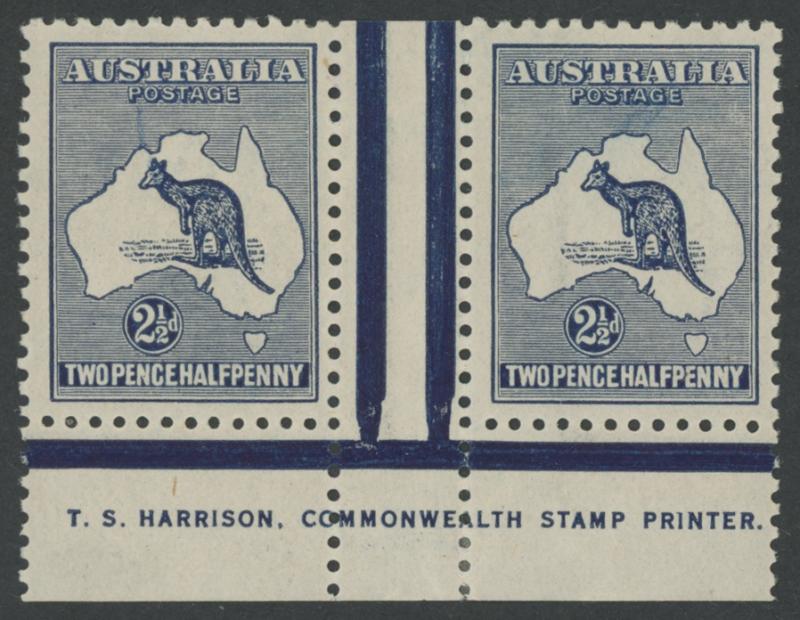 2½d indigo SG 36 Plate 1 TS Harrrison Single-Line Imprint pair ACSC 11C(1)zg, well-centred for an imprint, mounted, Cat $2000. A