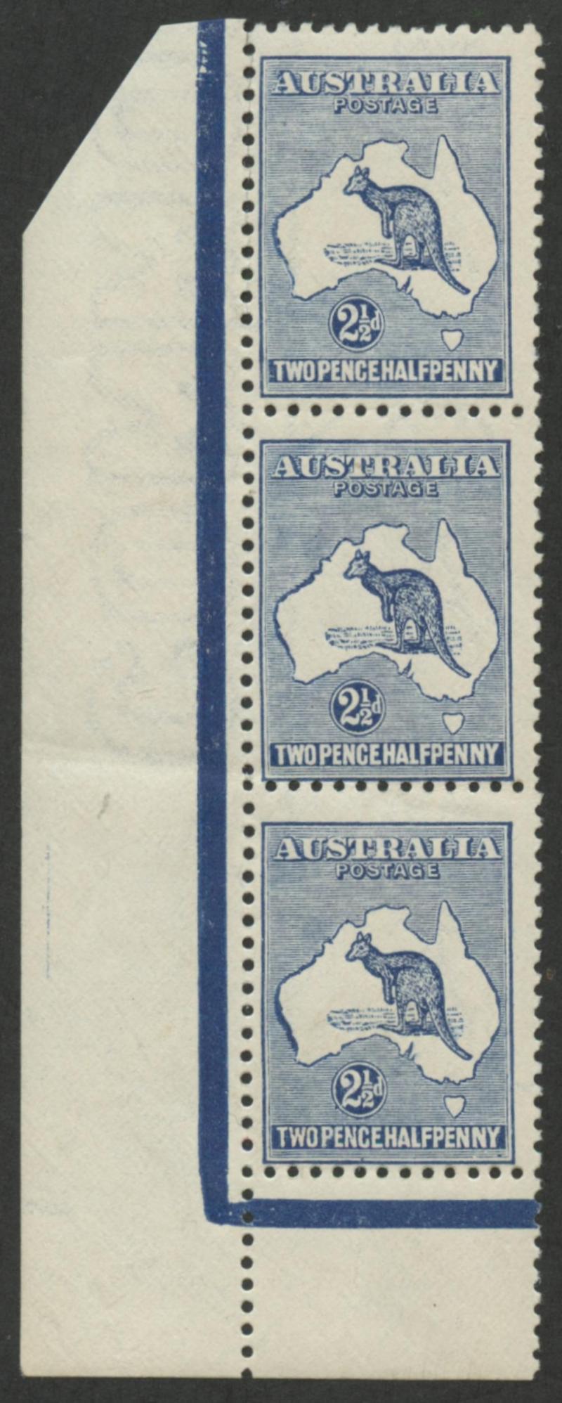 2½d blue SG 36 Plate 2 marginal vertical strip of 3 from the lower-left corner of the sheet with Retouch to First 'A' of Australia
