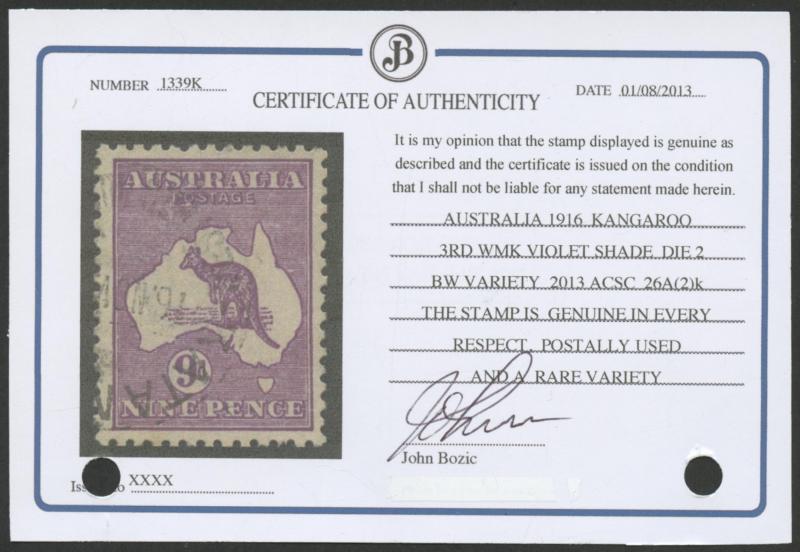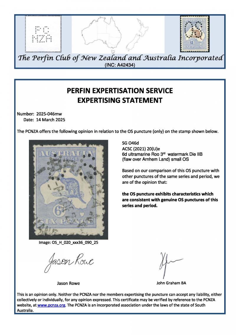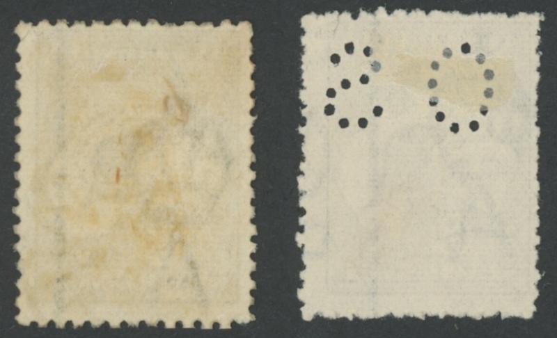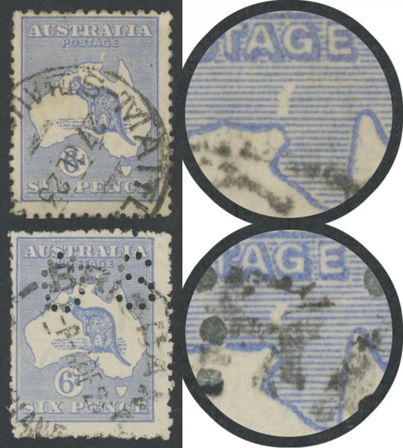 of '27JL23' clear of the variety, the other Punctured 'OS' with Brisbane cds cancel of [??]SE23' just impinging on the variety, both with minor faults, Cat $2400+ for unpunctured. The ACSC states that "Variety 20(3)j is rare and at present only four
