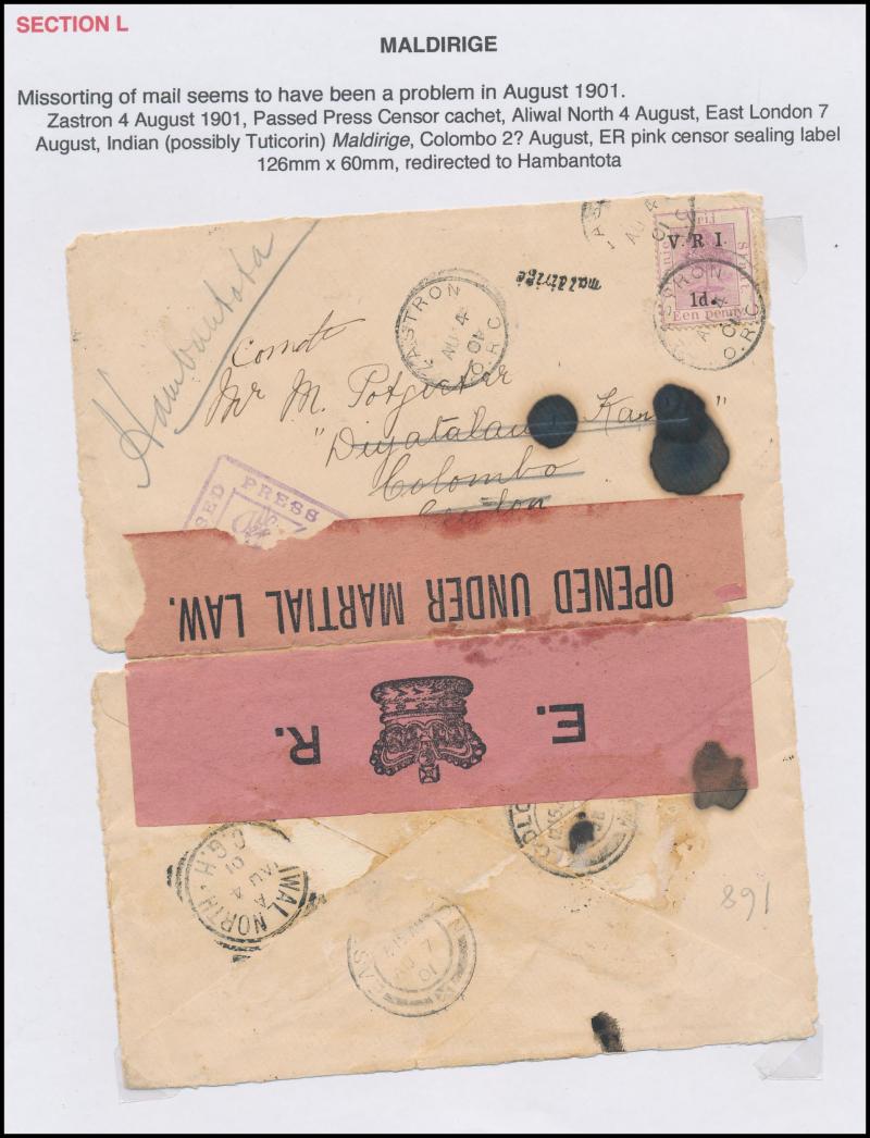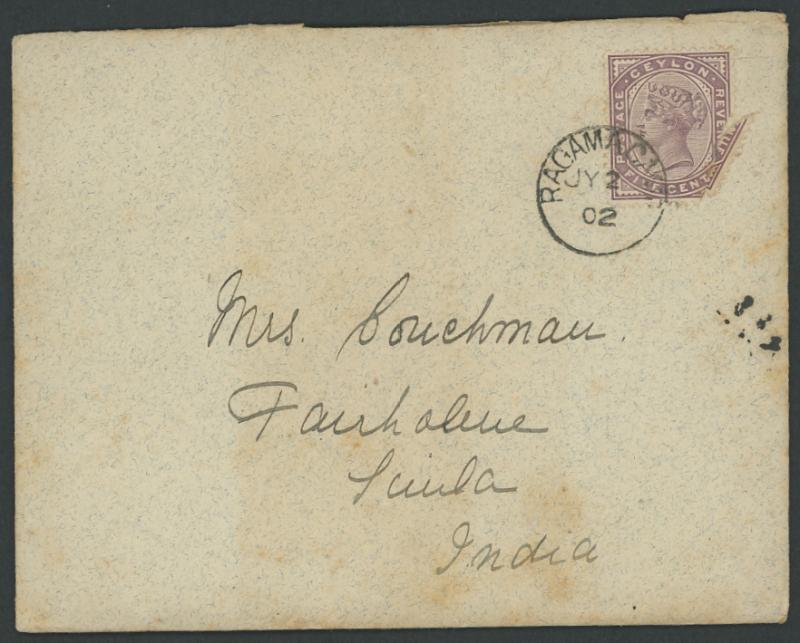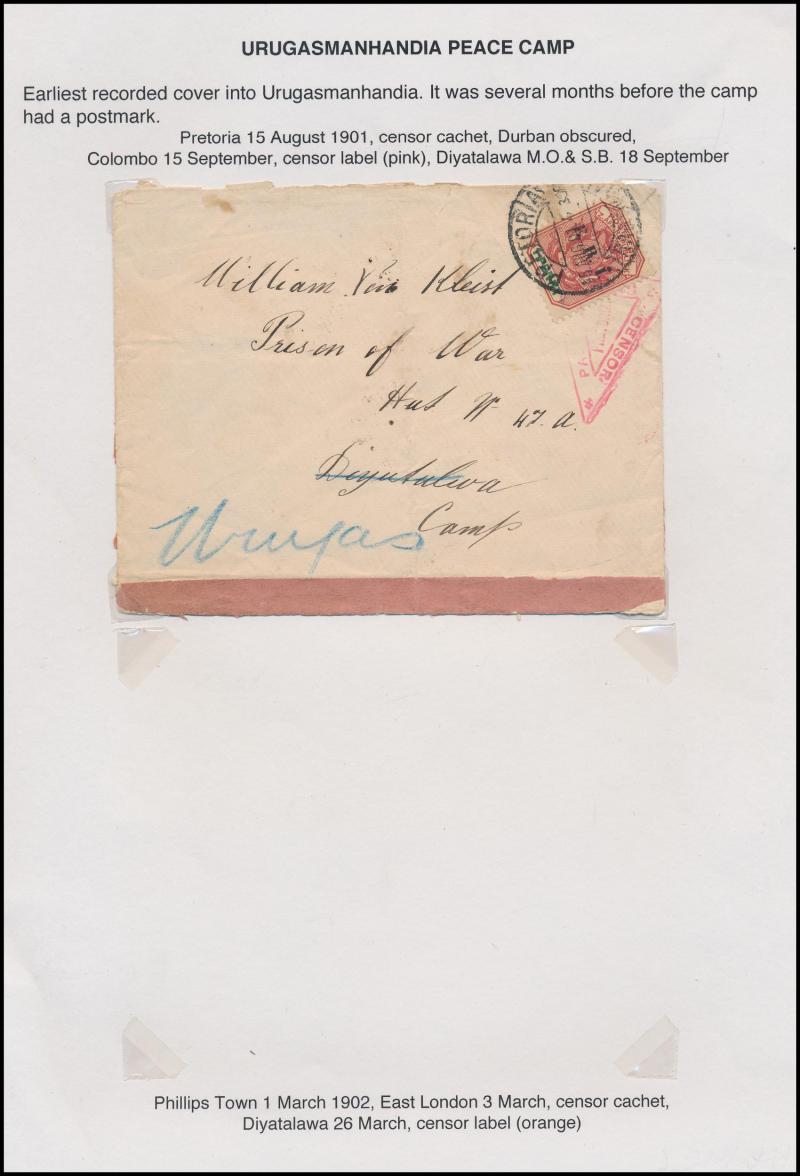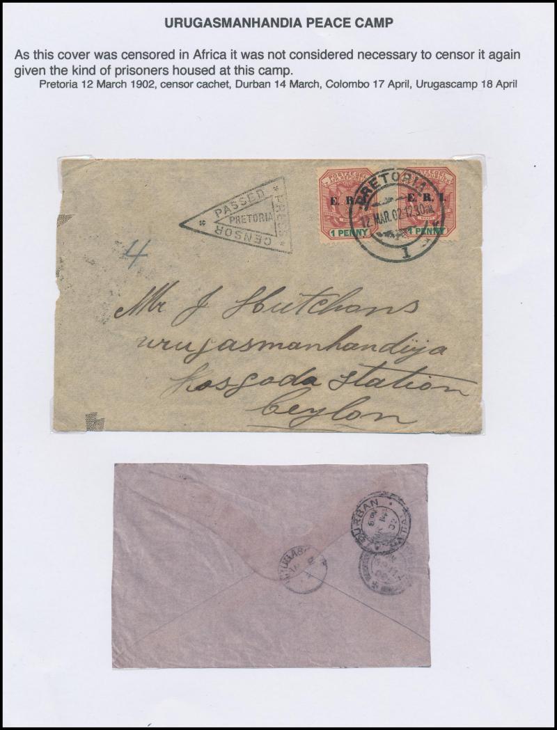 CAMP' cds (recorded 13 months only), Pretoria transit - where endorsed "Irene" - & 'IRENE' arrival backstamps both of 26SEP02, light soiling. Mail from Urugasmanhandiya - rendered by the writer as "Urichhasmeahandied"; close enough! - is much scarcer