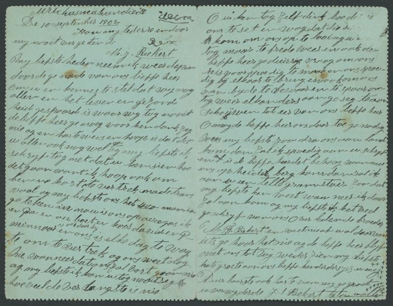 1902 (Sep 10) use of 6c green Letter Card to "Prisoners Kamp/Dist Pretoria Transvaal" with largely very fine strike of the 'URUGAS